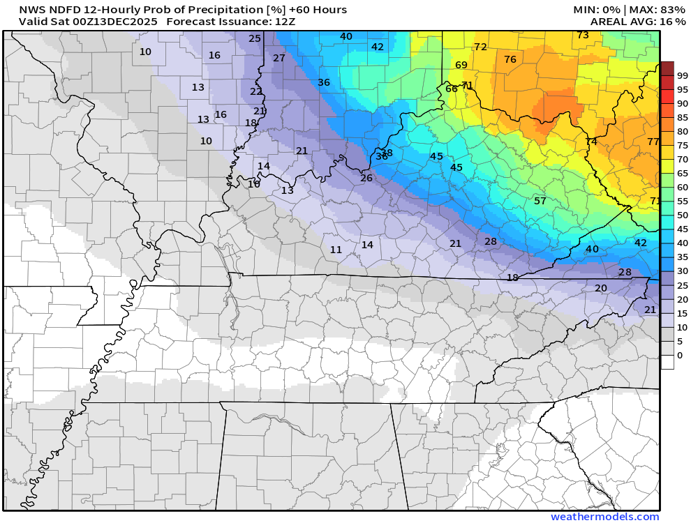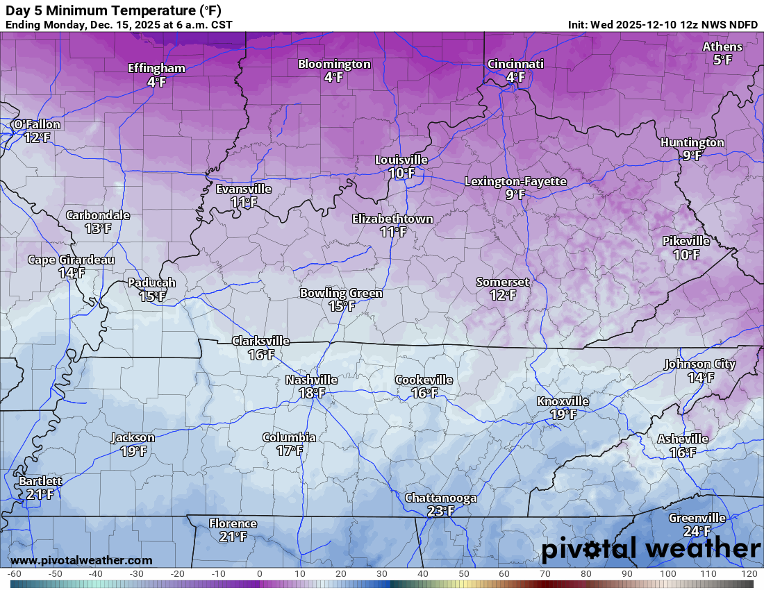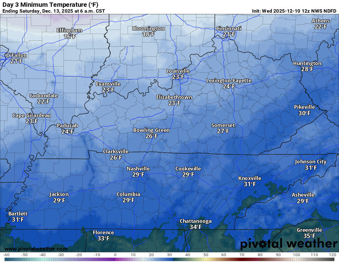 It still appears that Sunday morning will be the coldest. That would mean low teens near Mt Vernon to the middle teens and lower twenties across the Missouri Bootheel and along the Kentucky/Tennessee border southward.