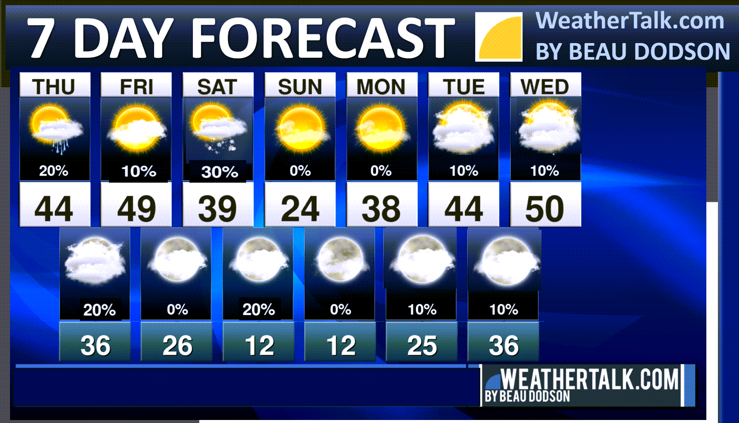 5. Will the temperature fall below 20 degrees? YES. A slight chance on Friday night. A high chance on Saturday and Sunday night.