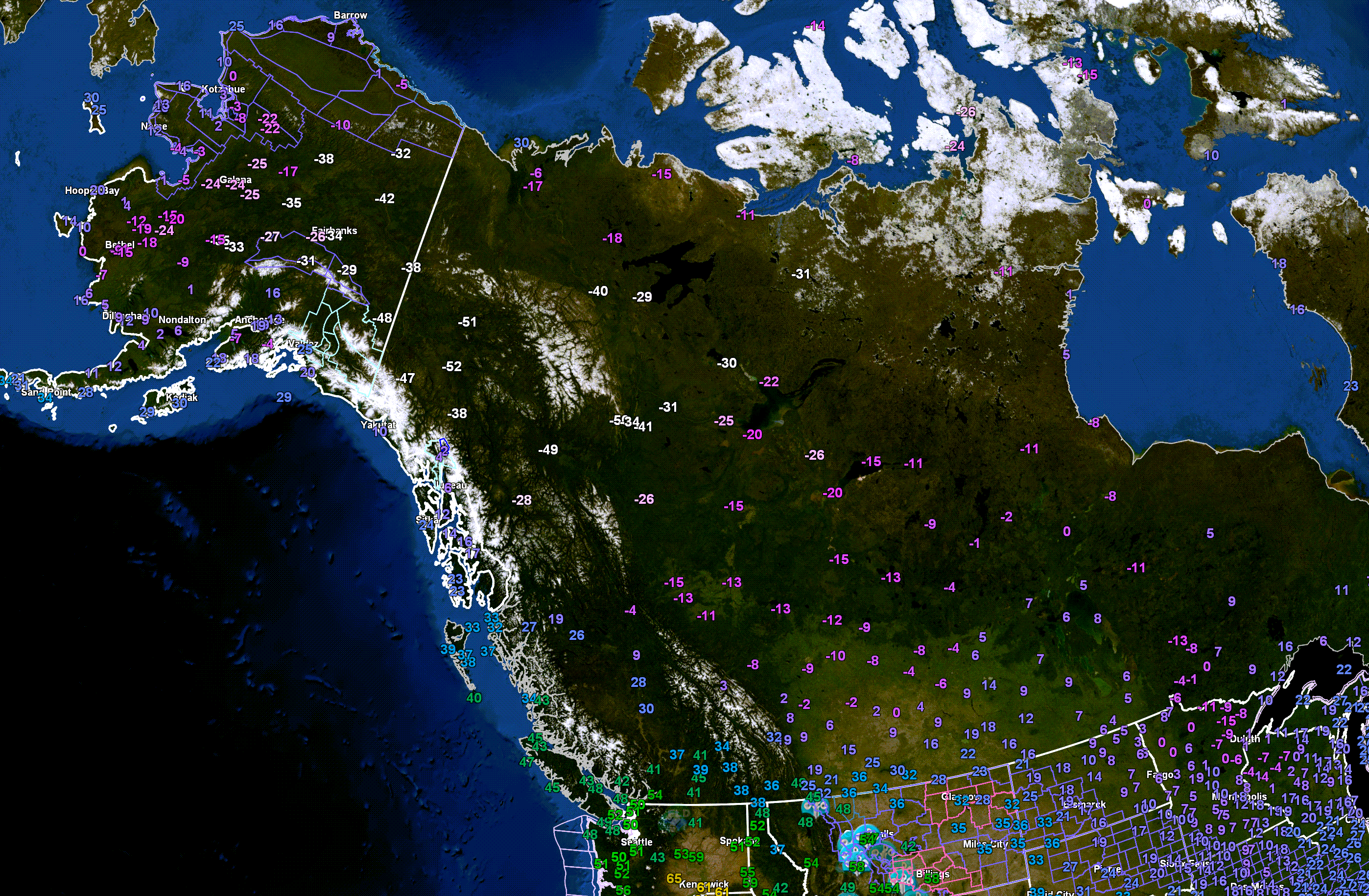 Once again, check out the temperatures in Alaska and Canada. Yes, some locations are -50 below zero! Wind chill values are in the -60s. Incredibly cold.