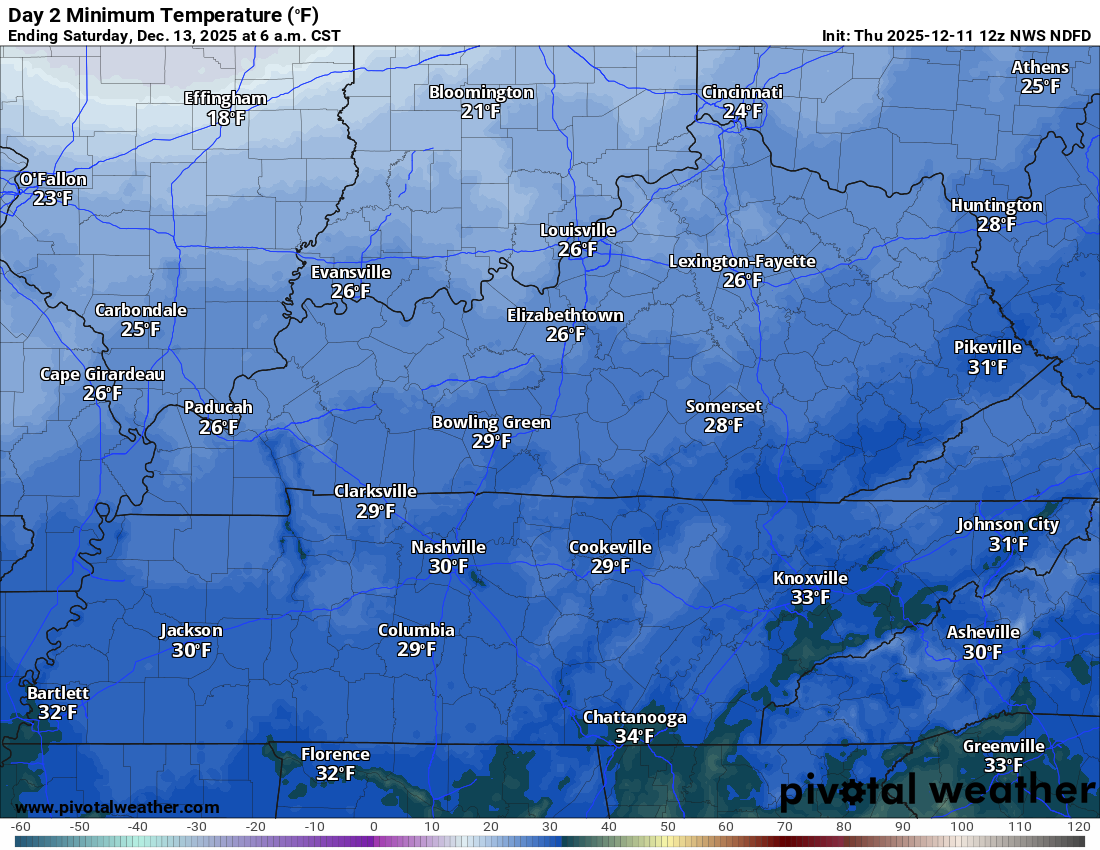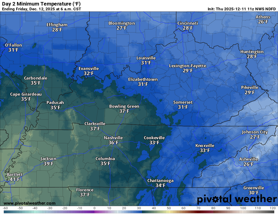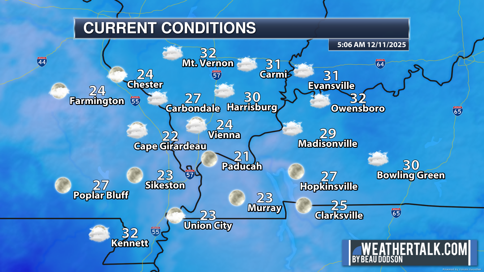 Lows tonight will be in the 30s, perhaps near freezing from Mt Vernon southeast to Owensboro.
