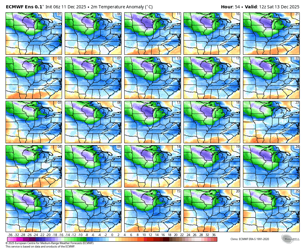 Notice all the blue? That equals below-average temperatures. Notice how all the squares agree? That means a HIGH confidence in the forecast outcome.