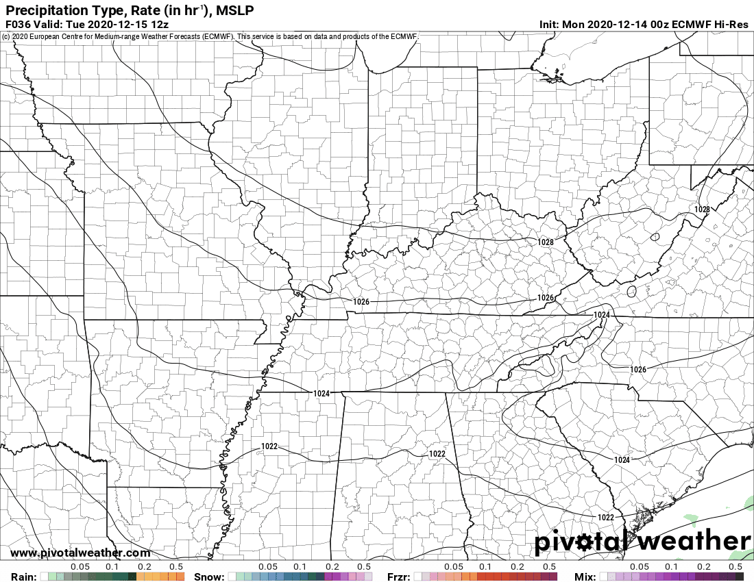 Temperature range: MO Bootheel 30° to 32° SE MO 26° to 30° South IL 26° to 30° Northwest KY (near Indiana border) 26° to 30° West KY 26° to 30° NW TN 26° to 30°