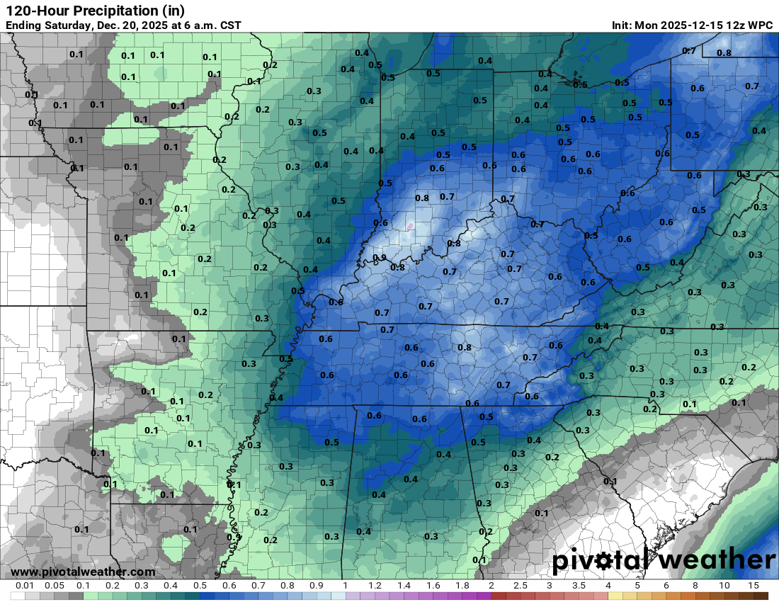 Rainfall totals over Missouri and Illinois will mainly range from 0.10″ to 0.30″. Rainfall totals over Kentucky and Tennessee will range from 0.30″ to 0.60″. Locally higher in thunderstorms.
