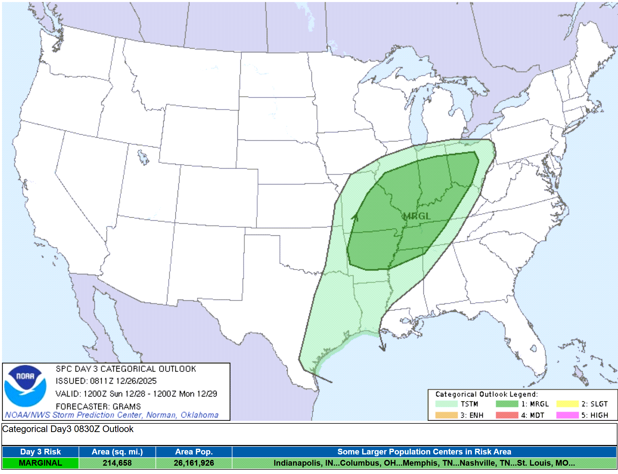 The dark green zone is the level one risk. That is the lowest risk that the SPC has. The scale ranges from one to five.