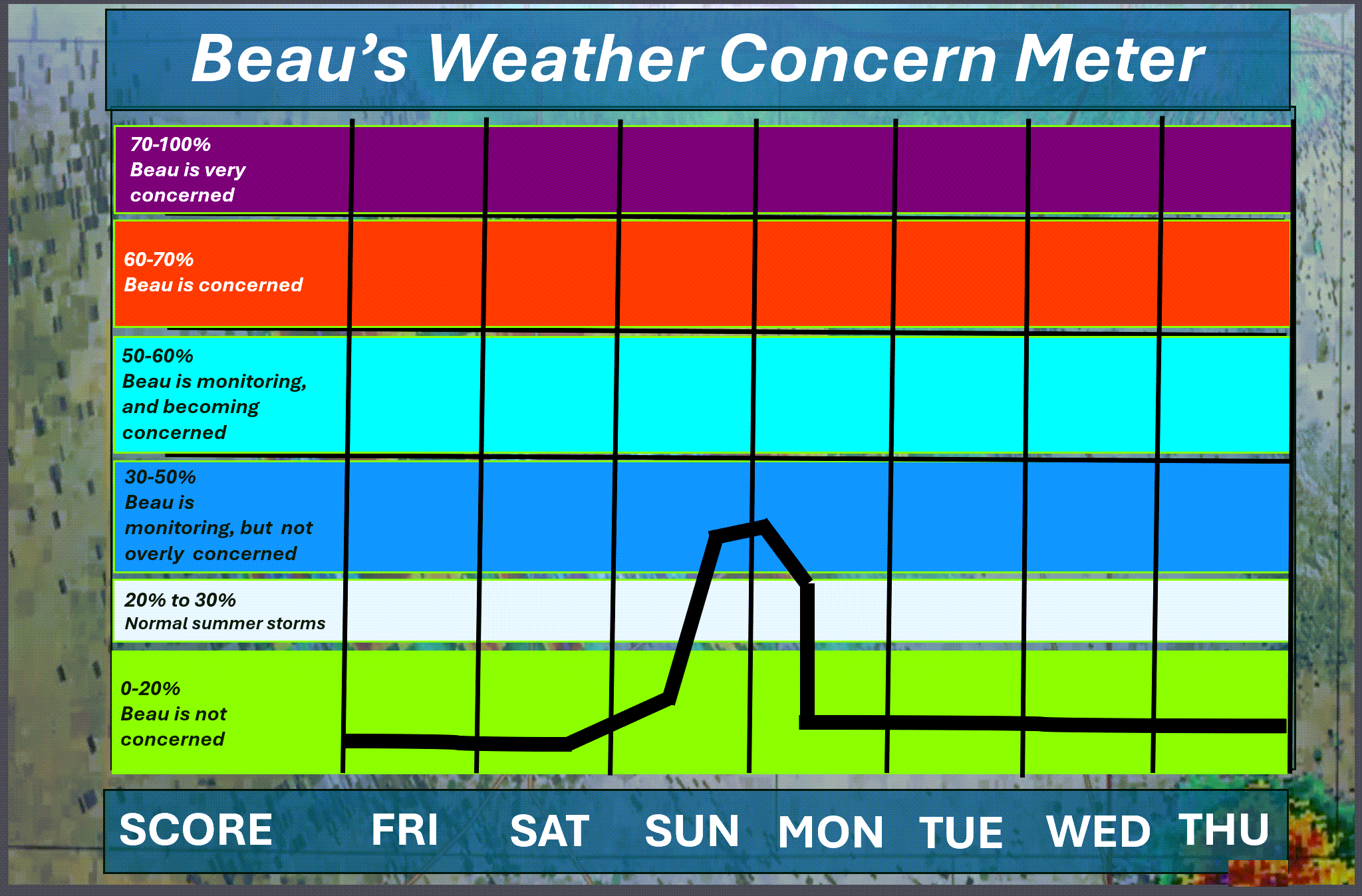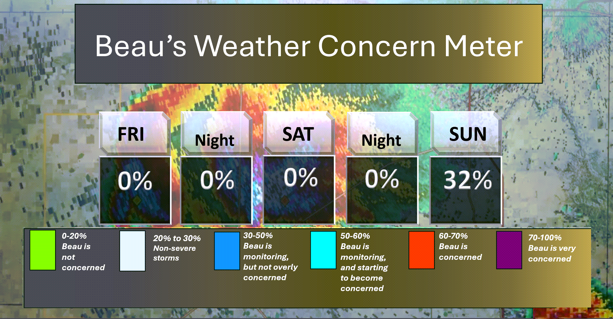 A few of the thunderstorms could be severe on Sunday afternoon and Sunday night. Confidence, however, remains low. Monitor your Beau Dodson Weather App.