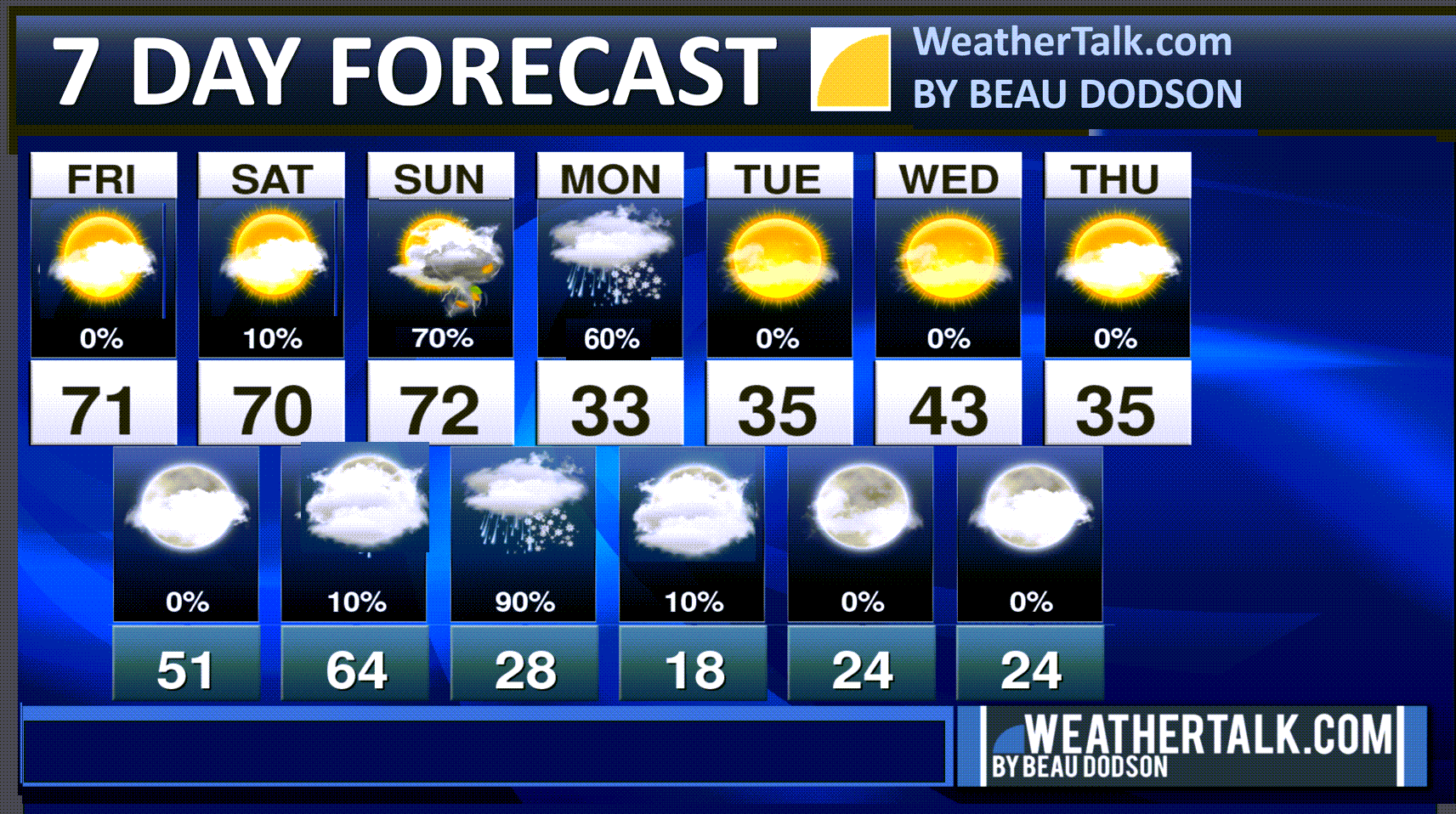 A strong cold front will arrive on Sunday night and Monday morning. This will bring showers and thunderstorms. It also means much colder temperatures for Monday/Tuesday.