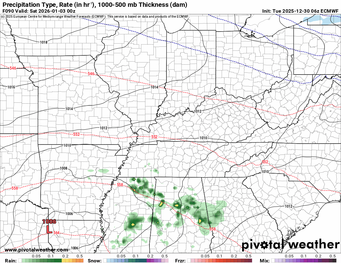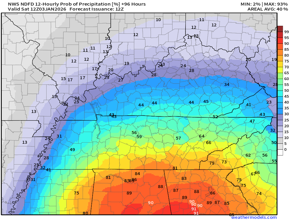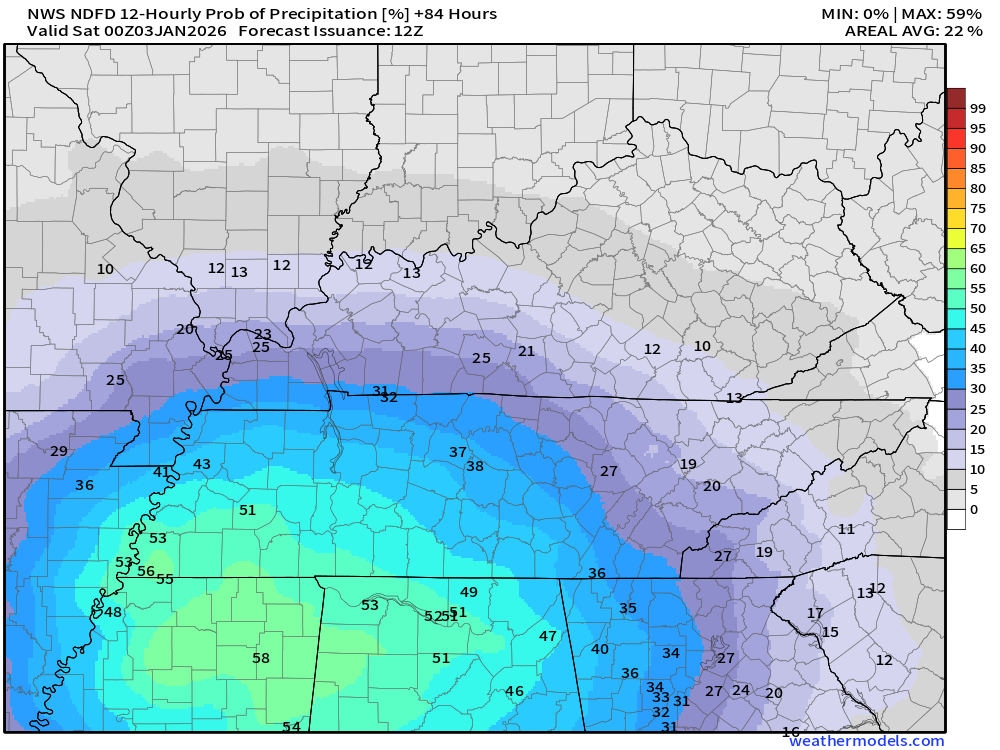 The chance of rain is highest along the MO/AR and KY/TN border. In other words, my southern counties.