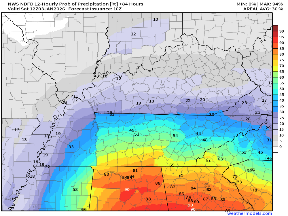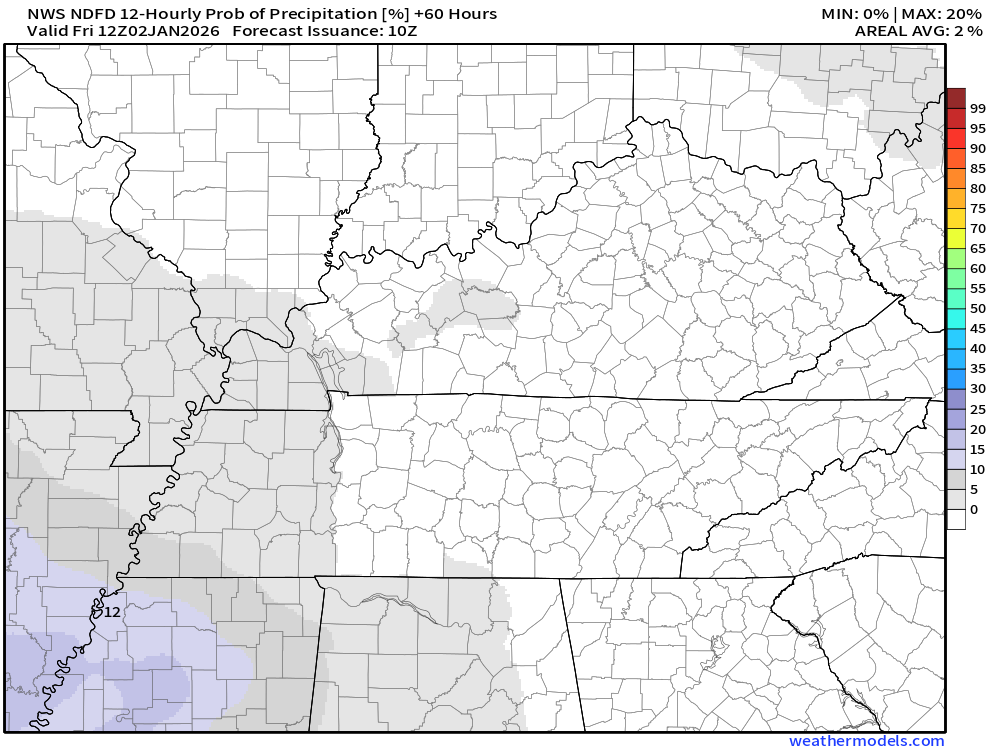 The chance of rain is highest along the MO/AR and KY/TN border.  In other words, my southern counties.