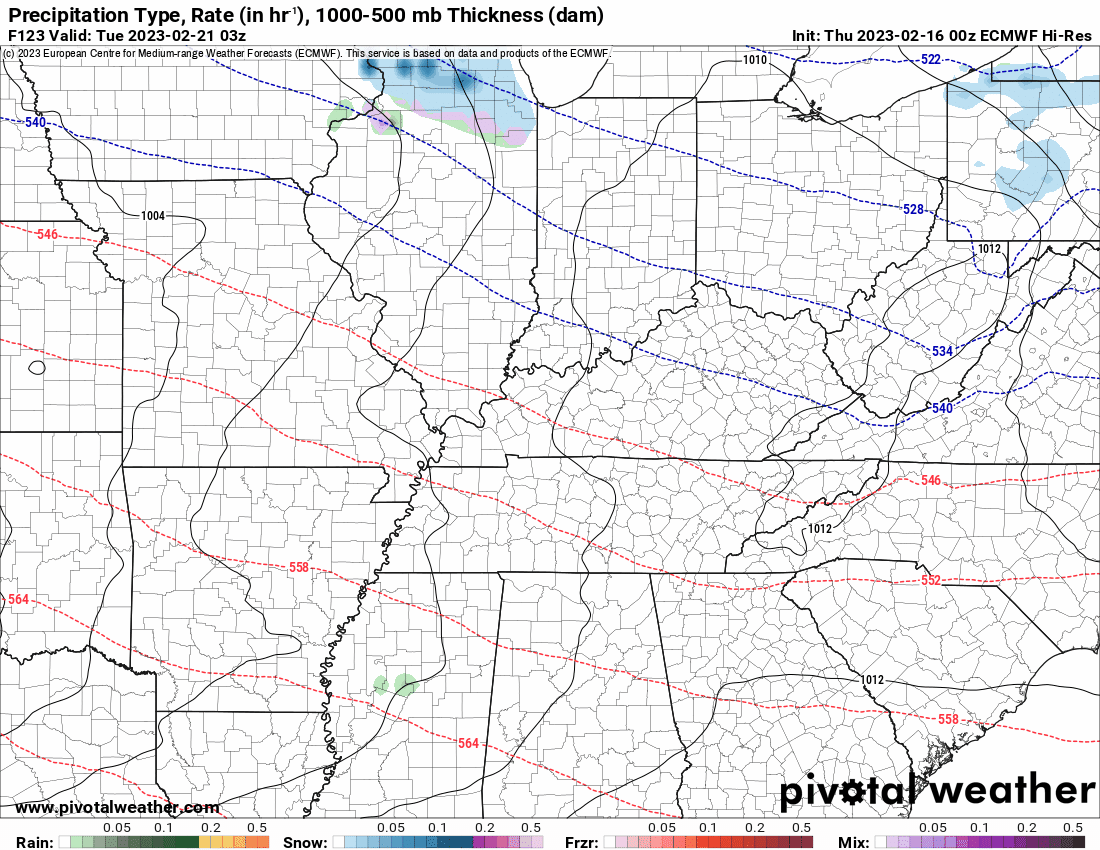 Red represents freezing rain. Purple represents sleet. Blue represents snow. Dark blue represents heavy snow.