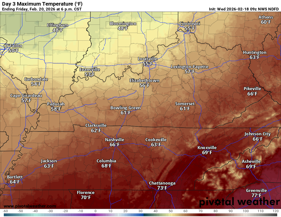 Friday’s high temperatures.  A bit cooler behind the Thursday cold front.