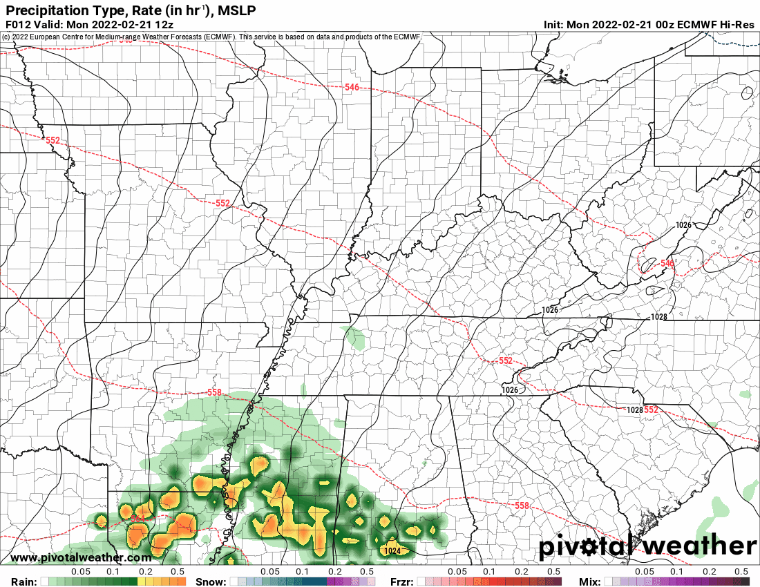 Temperature range: MO Bootheel 34° to 38° / SE MO 33° to 36° / I-64 Corridor of South IL 33° to 36° / South IL 34° to 36° / Northwest KY (near Indiana border) 34° to 38° / West KY 34° to 38° / NW TN 35° to 40°