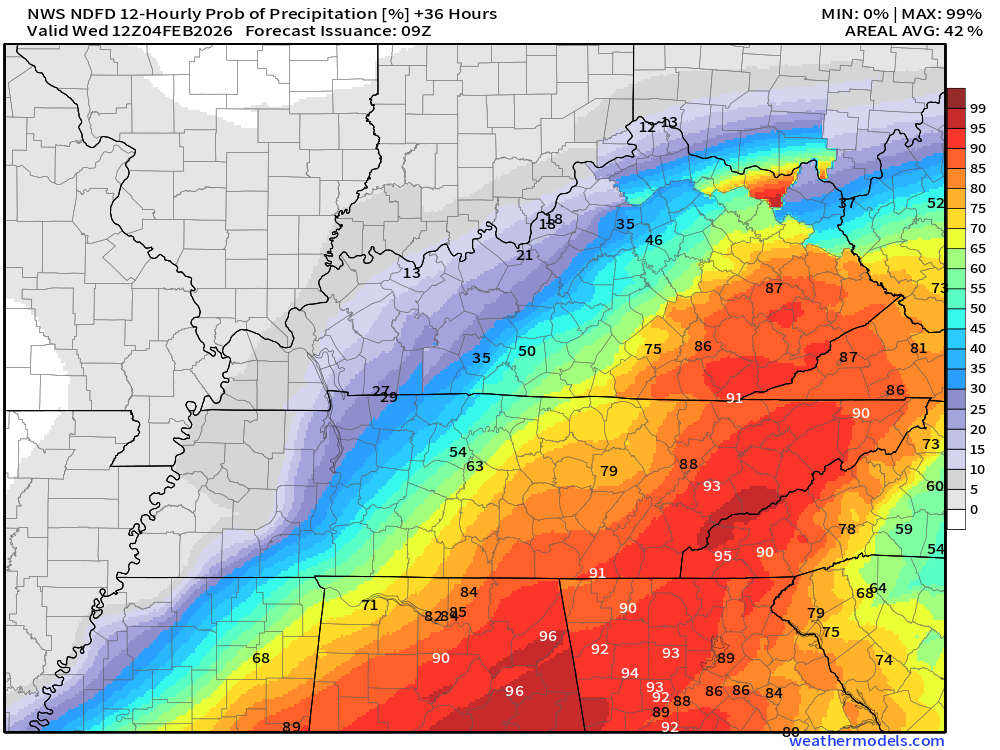 The chance of precipitation (see graphics below) is higher across southeastern IL and western KY/northwestern TN.  They are lower over southwest IL and SE MO.