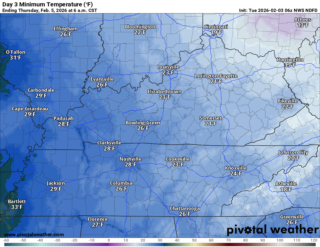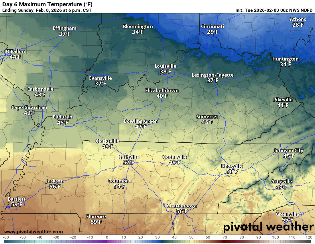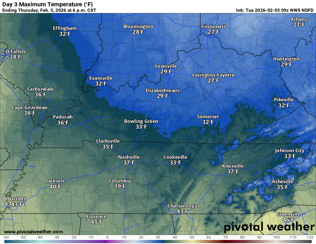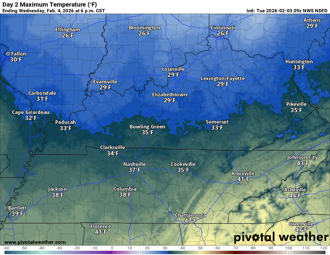 Notice the warmer temperatures in the Bootheel and Tennessee.  That is a different NWS Office, and there is disagreement on temperatures.