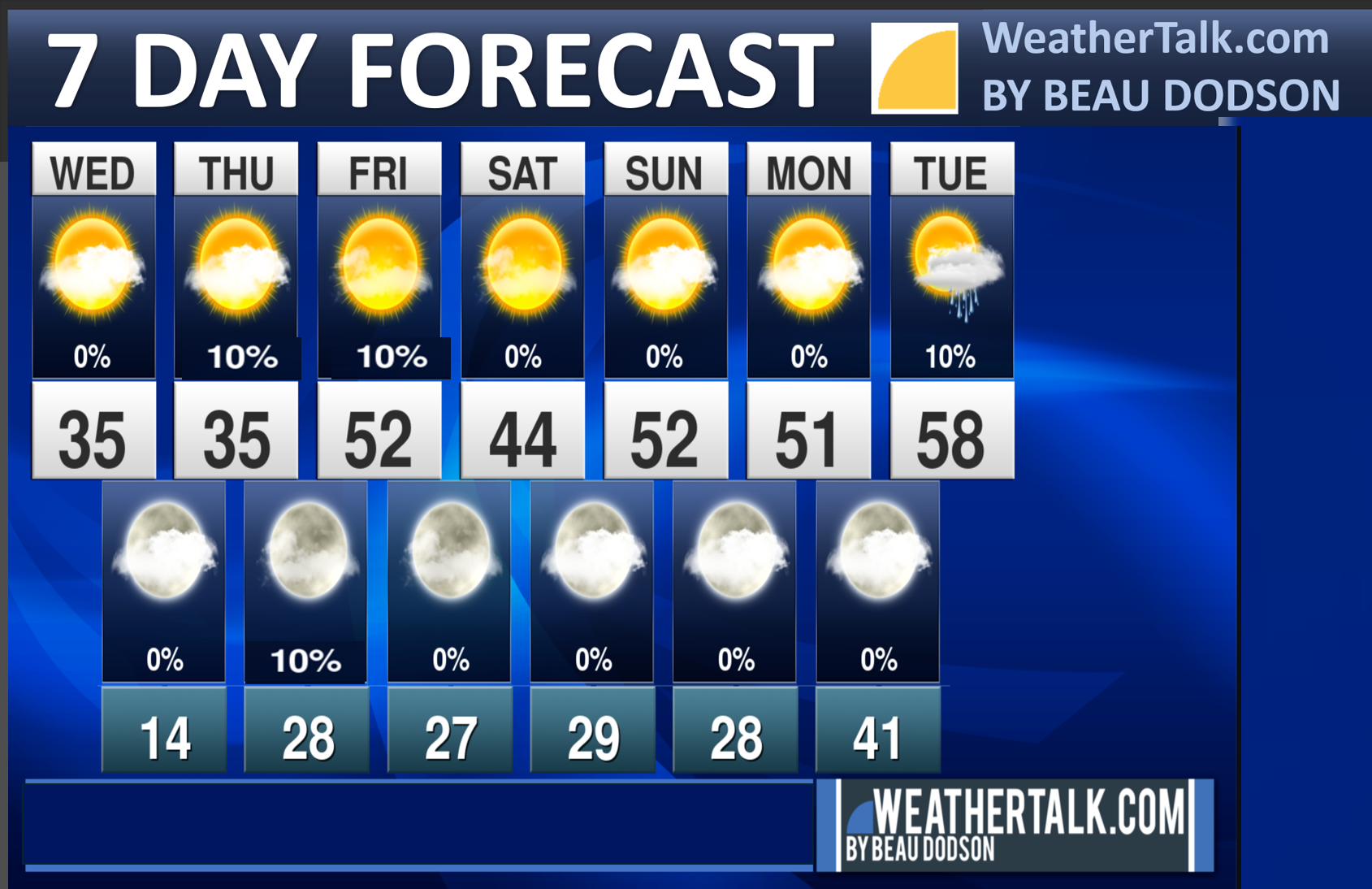 Let’s look at high temperatures for the upcoming week. Overnight lows will be colder, but not as extreme as recent days.