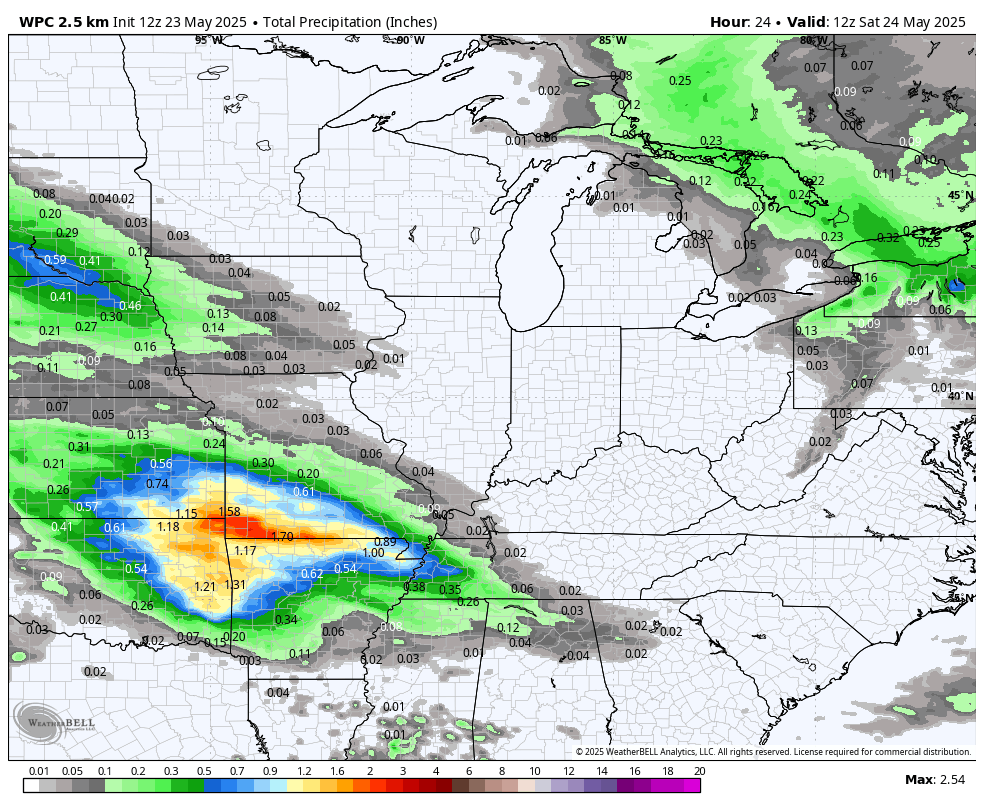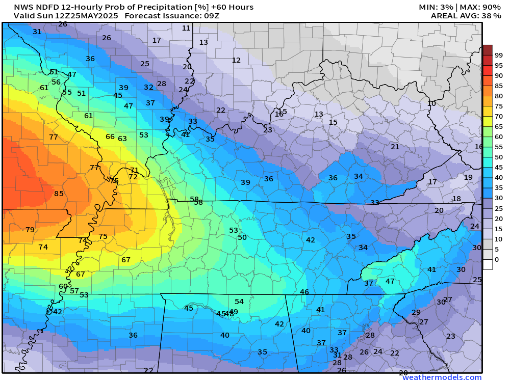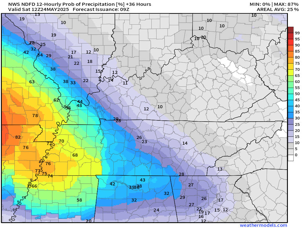The SPC has a low risk of a few intense storms across far southern Missouri into the Bootheel and parts of western Tennessee on Saturday. For now, I kept that out of the forecast. I will reevaluate it again tomorrow.