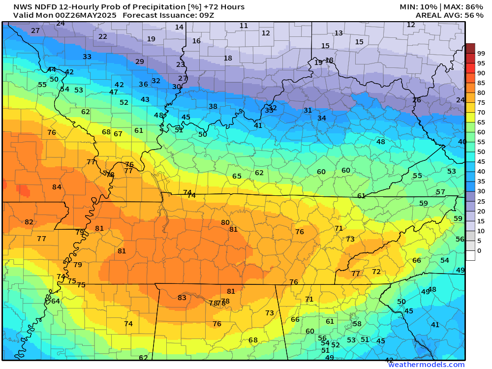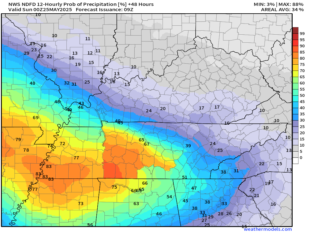 Yes, there will be some rain showers this weekend. It won’t rain all the time. Some locations may be mostly dry tonight and tomorrow, especially across portions of Illinois and Kentucky. Keep that in mind.