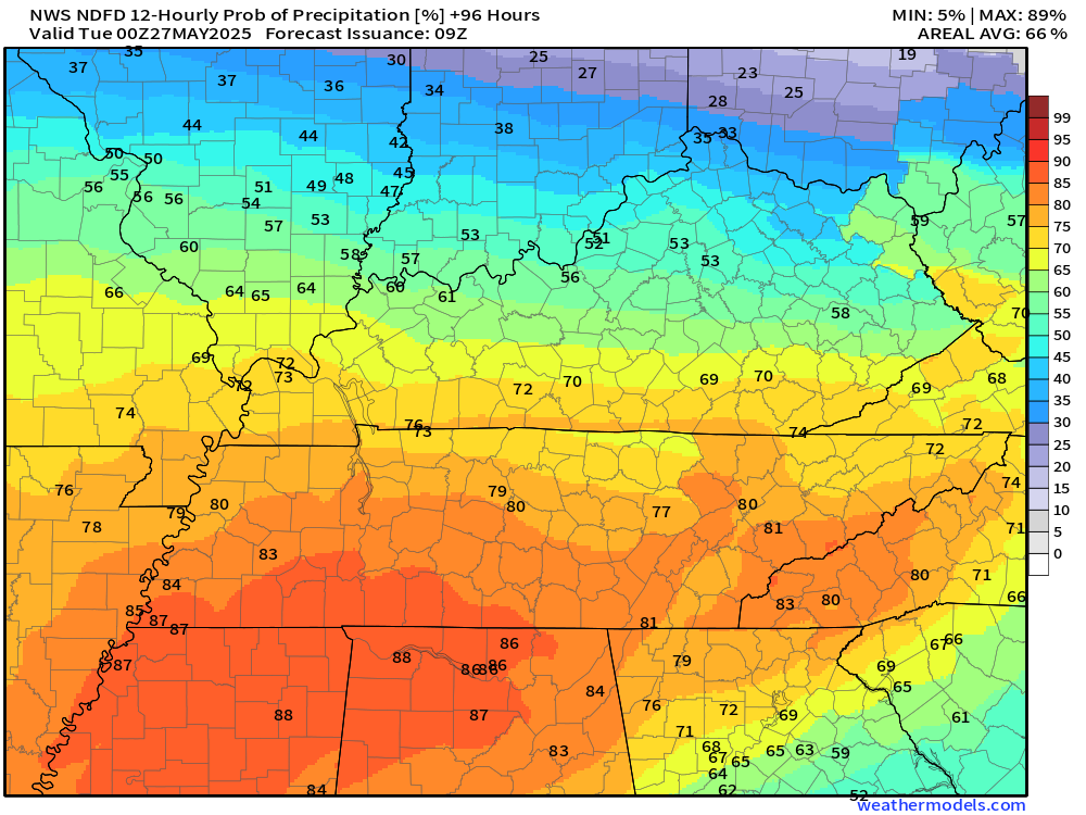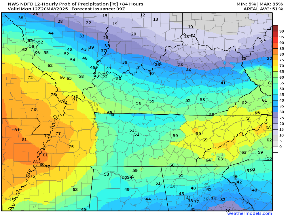As you can see, there will be periods with greater rain probabilities. Plan accordingly.
