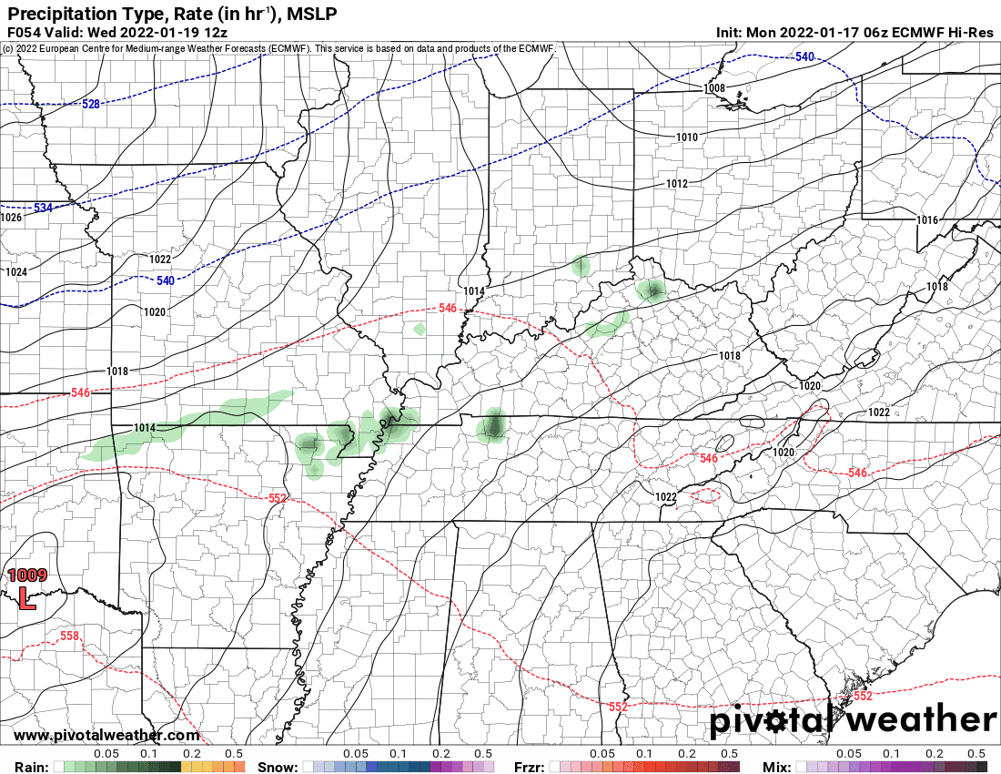 Temperature range: MO Bootheel 36° to 40° /  SE MO 35° to 40° / I-64 Corridor of South IL 35° to 40° /  South IL 36° to 40° /  Northwest KY (near Indiana border) 36° to 40° /  West KY 38° to 42° /  NW TN 38° to 42°