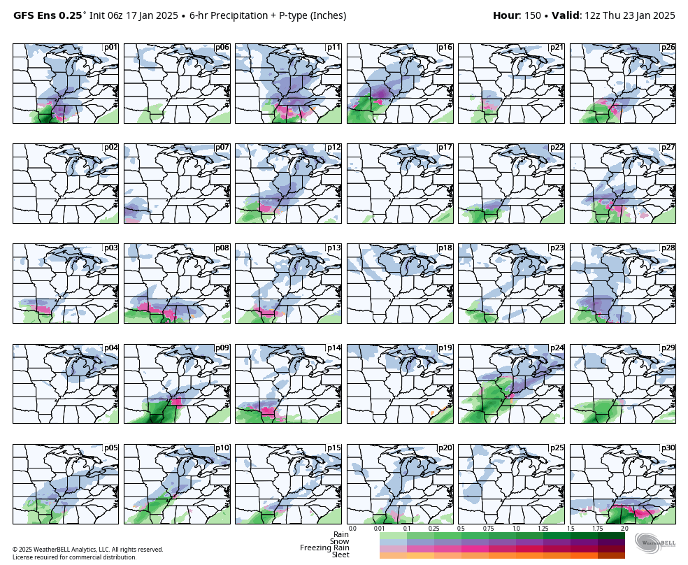 Very few squares show a snow or ice storm here next Thursday. Thus, I will watch the charts and leave the forecast dry, for now.