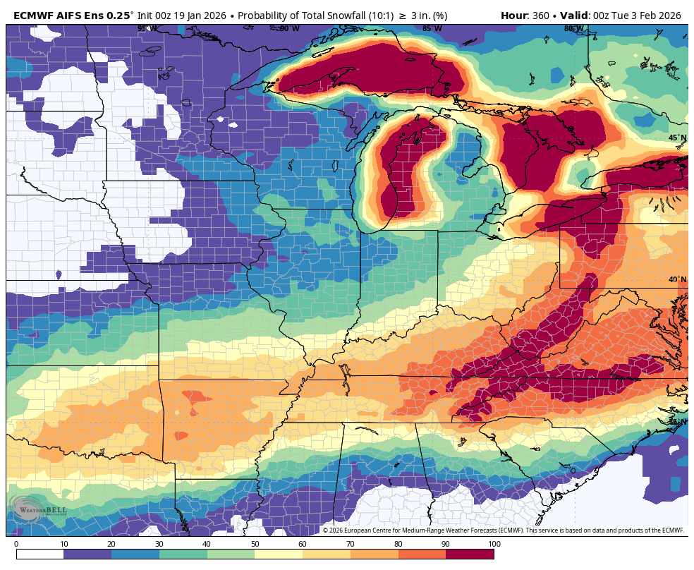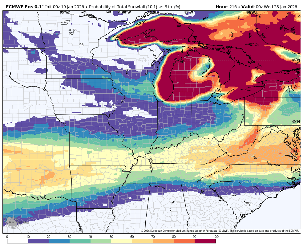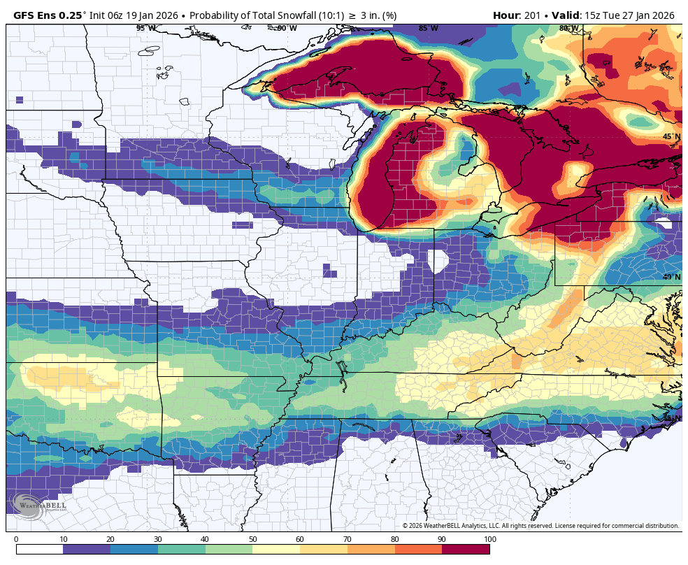 What is the probability of three or more inches of snow? It is a bit higher than the GFS model.