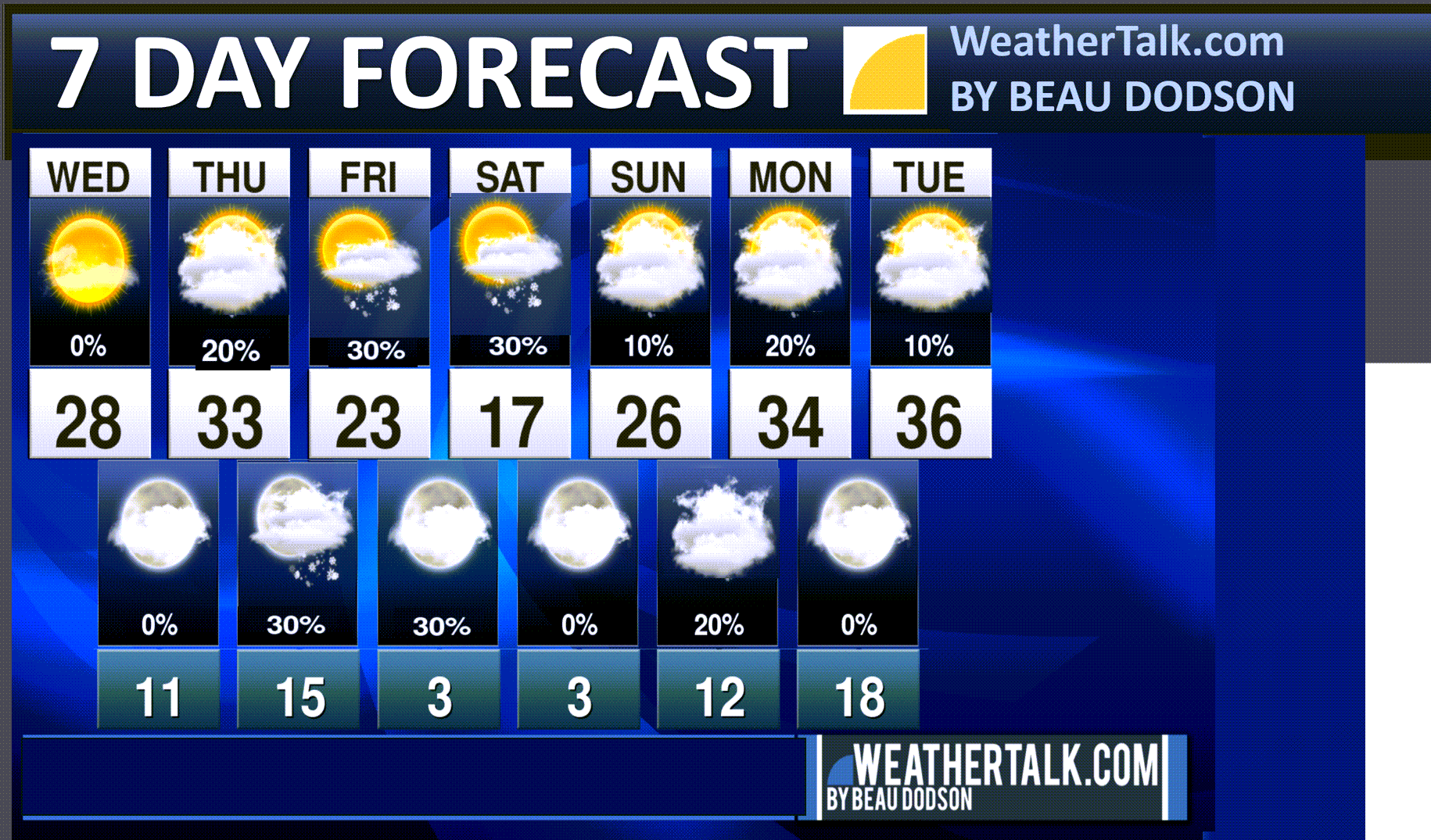 7.  Is accumulating snow (one inch or more of snow) or ice in the forecast?  LOW RISK.  Snow showers are possible from Thursday into the weekend.  Some of the data shows a dusting to an inch of snow.  Most areas will likely see 0 to a dusting.