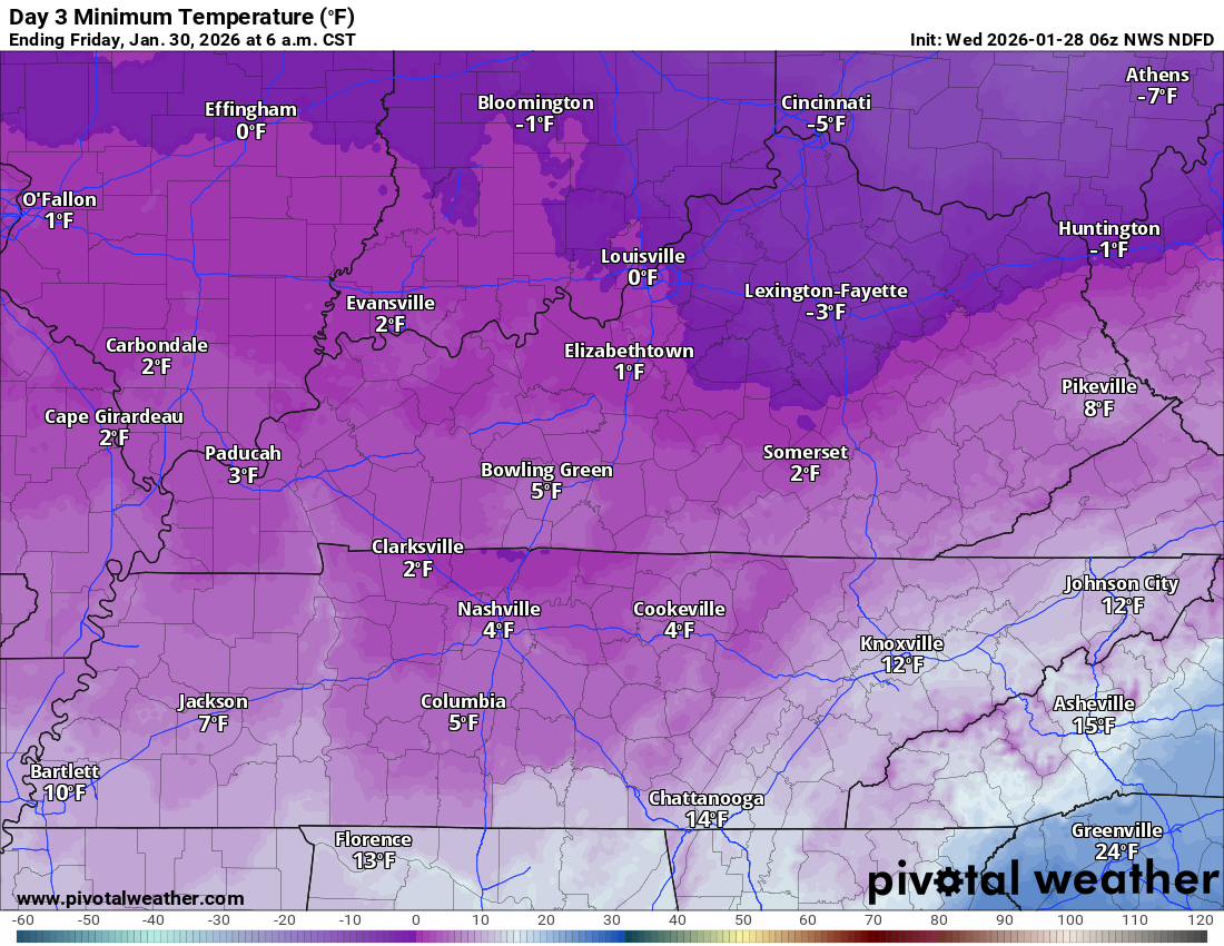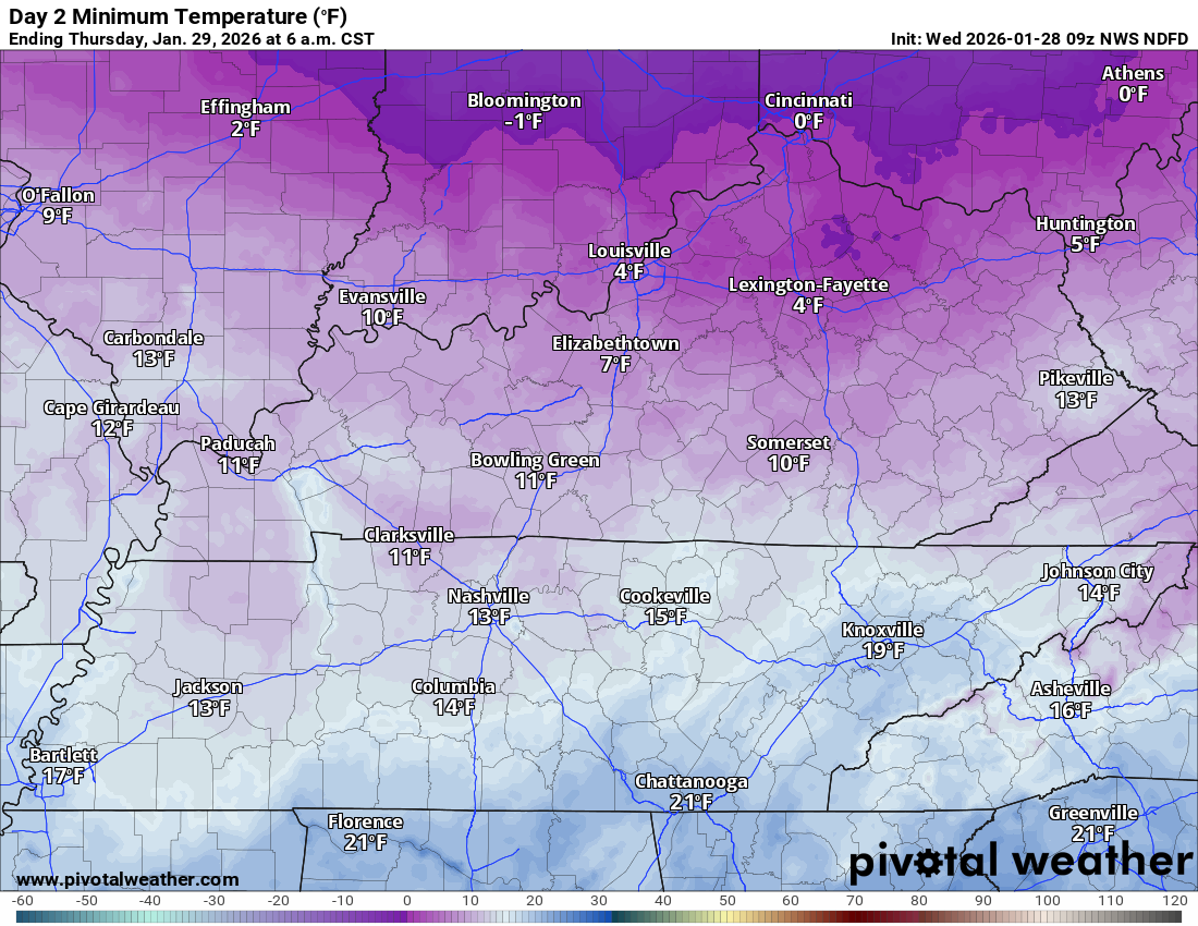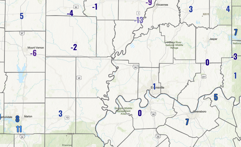 A WIDE variety of temperatures.  If you have a deeper snow pack, then temperatures are a bit lower than shown.  If you have a few clouds during the overnight period, then temperatures will be a tad warmer.  Either way, it is cold.