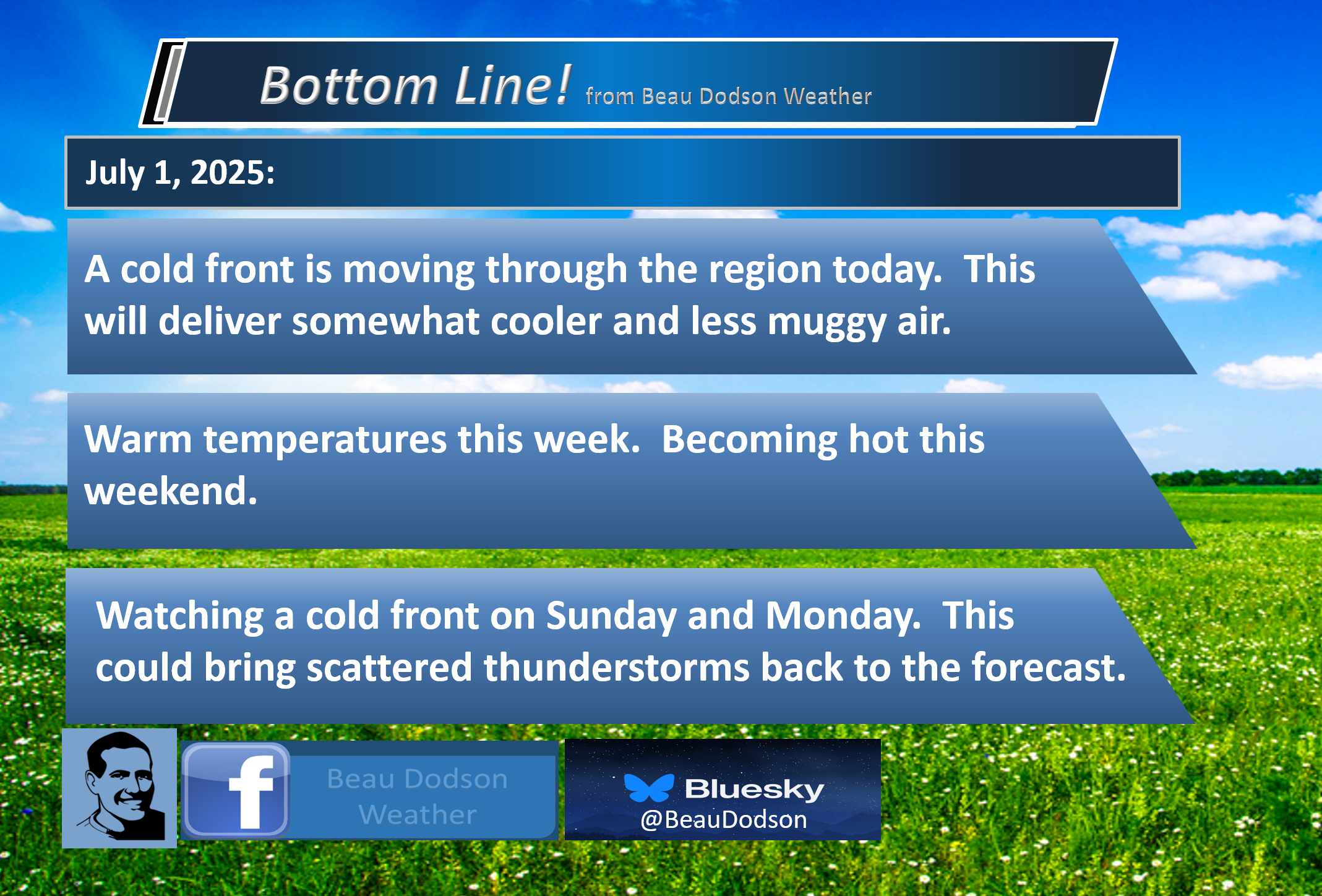 A cold front is expected to push into the region by Sunday and Monday. This will bring a return to the daily shower and thunderstorm chances. At this time, there remain questions on the strength of the front and timing.