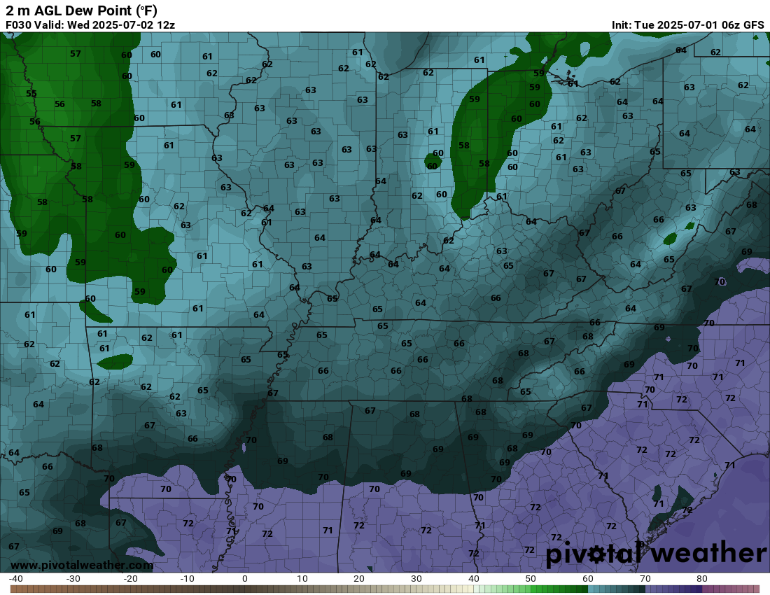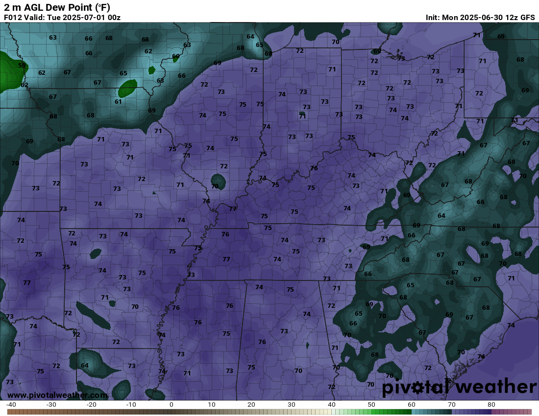 Dew point is a measure of moisture. The higher the dew point, the muggier it feels. Dew points in the seventies and eighties are oppressive. Muggy.