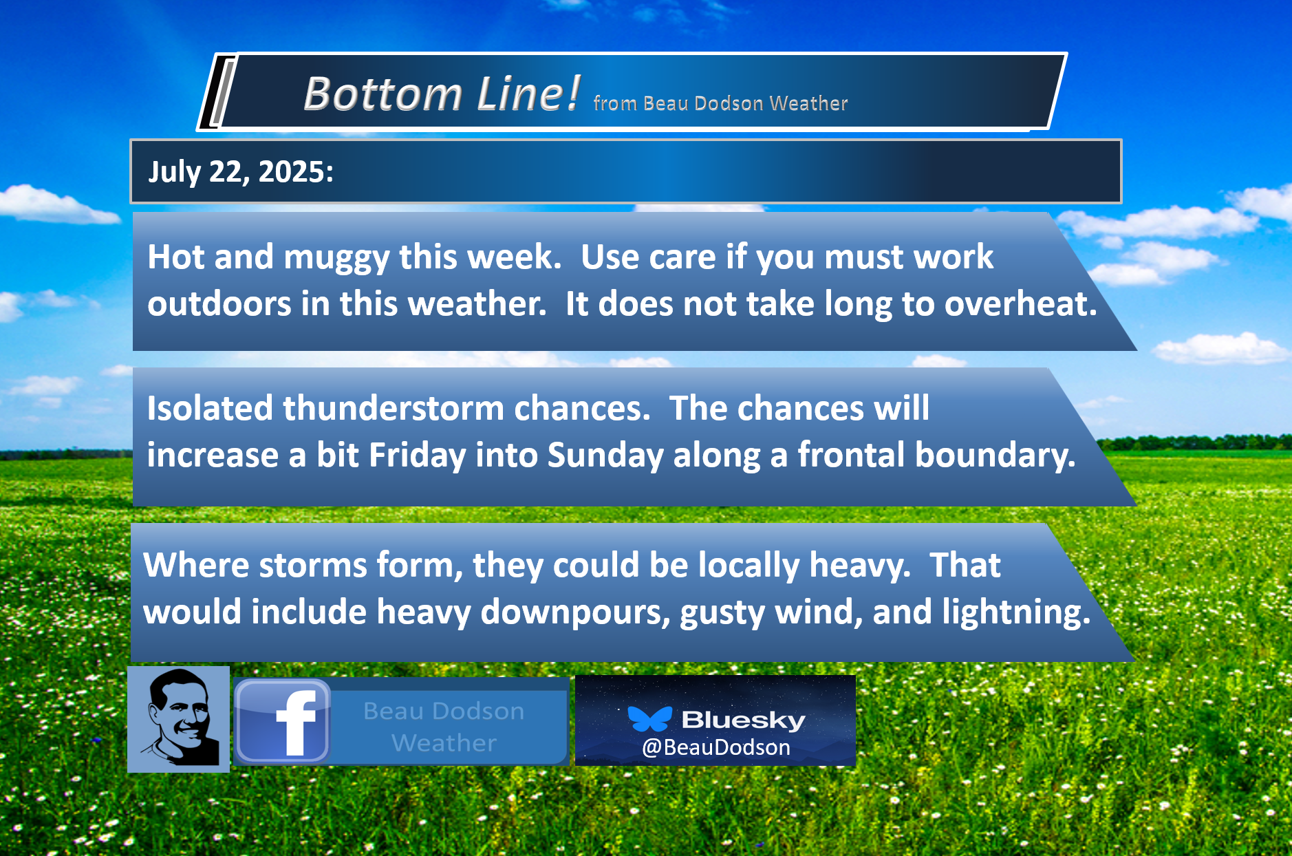 July 22, 2025: Hot and muggy. A few storms. Chances may be higher this weekend along a boundary.