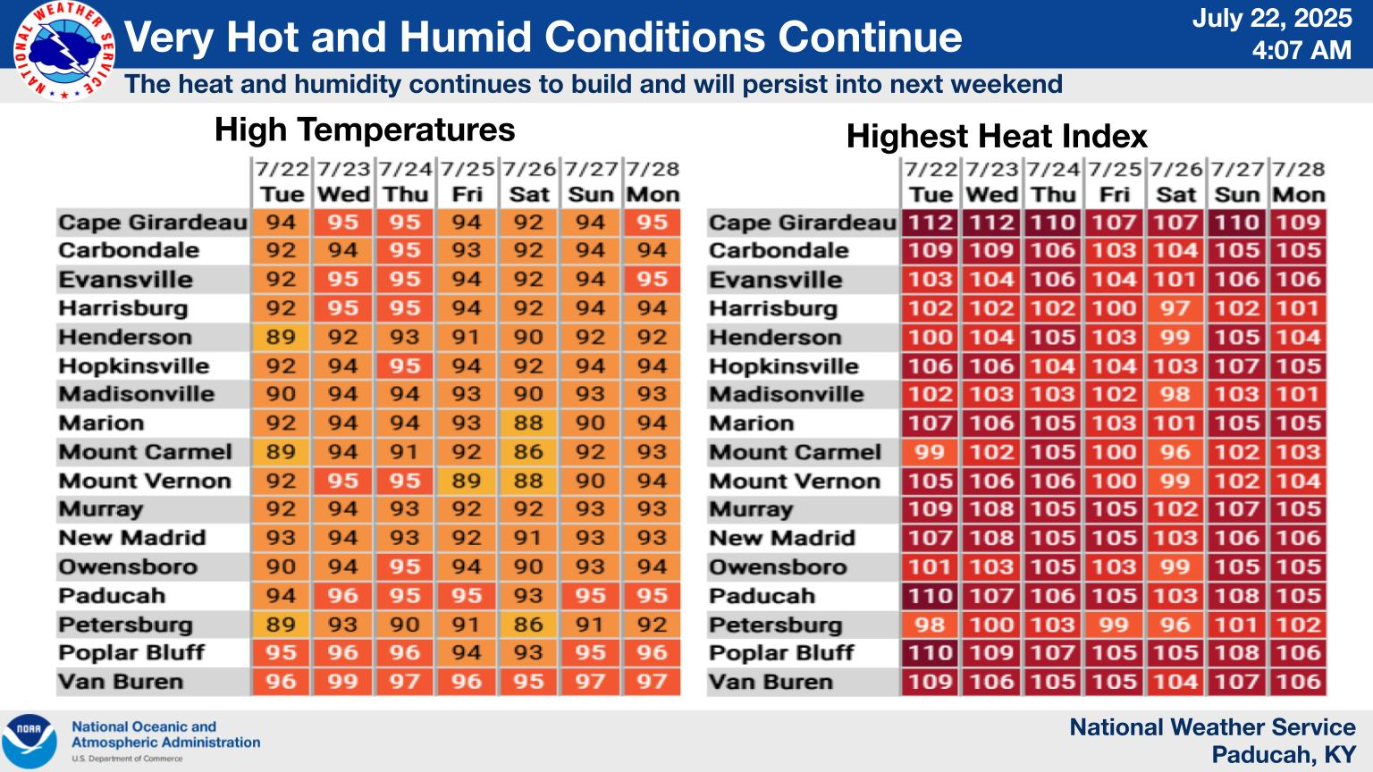 The big weather story will continue to be the heat.  Highs will be in the nineties this week.  Heat index values will range from 100 to 110 degrees.  Locally, 110 to 115 degrees.