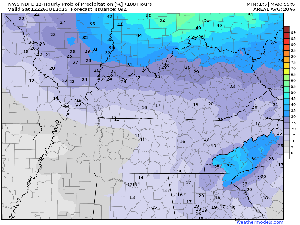 I am watching a weak frontal boundary this weekend.  Rain probabilities will be a bit higher on Saturday and Sunday.  For now, however, I kept them around 20 to 30%.  Those numbers could increase as confidence in the final forecast grows.