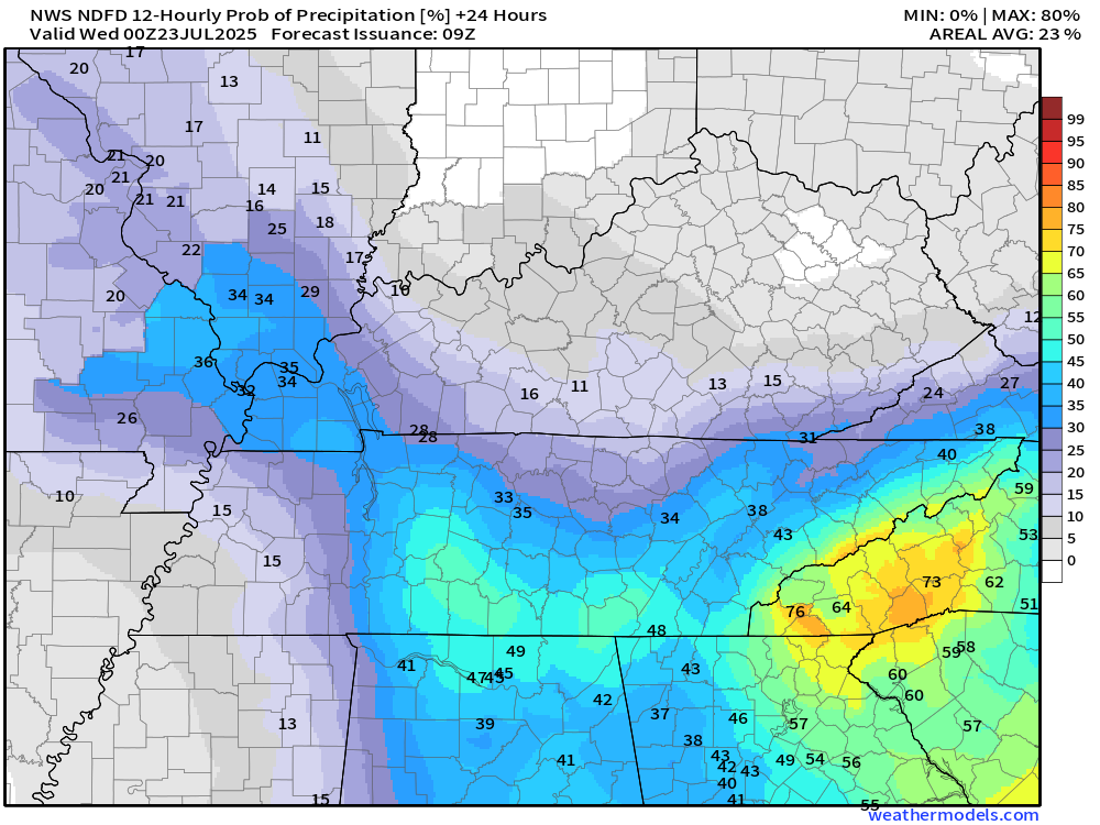 Remember, a 20% chance of thunderstorms during the summer months usually means someone will have a gullywasher, but many areas will remain dry.  It does not mean that it won’t rain on your picnic.