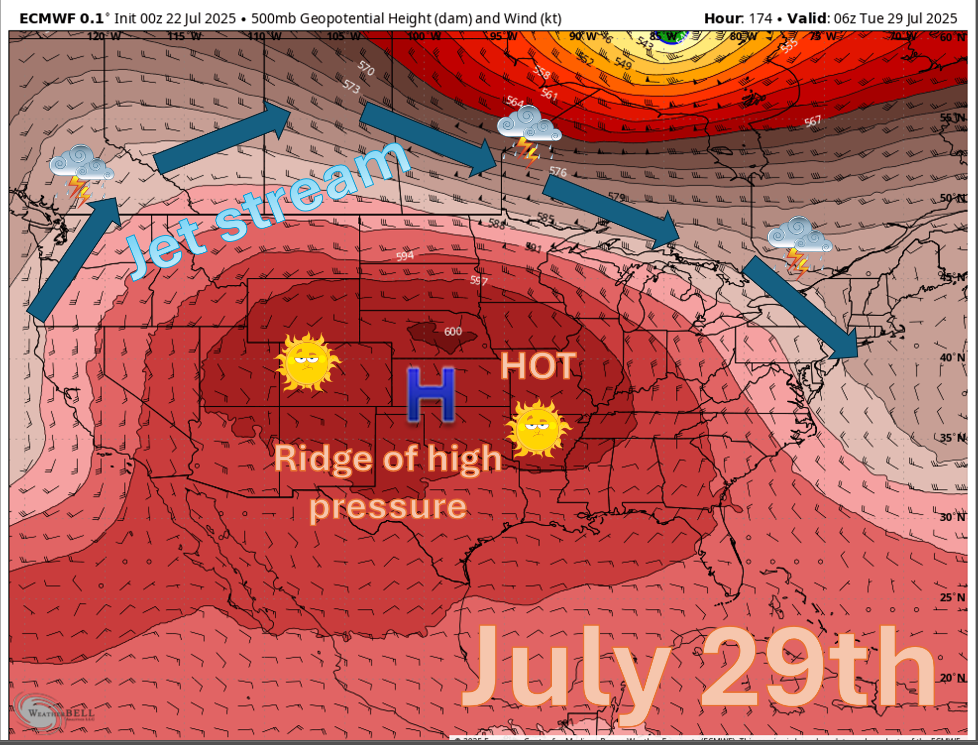 The ridge of high pressure is causing a large portion of the USA to bake in summer heat.