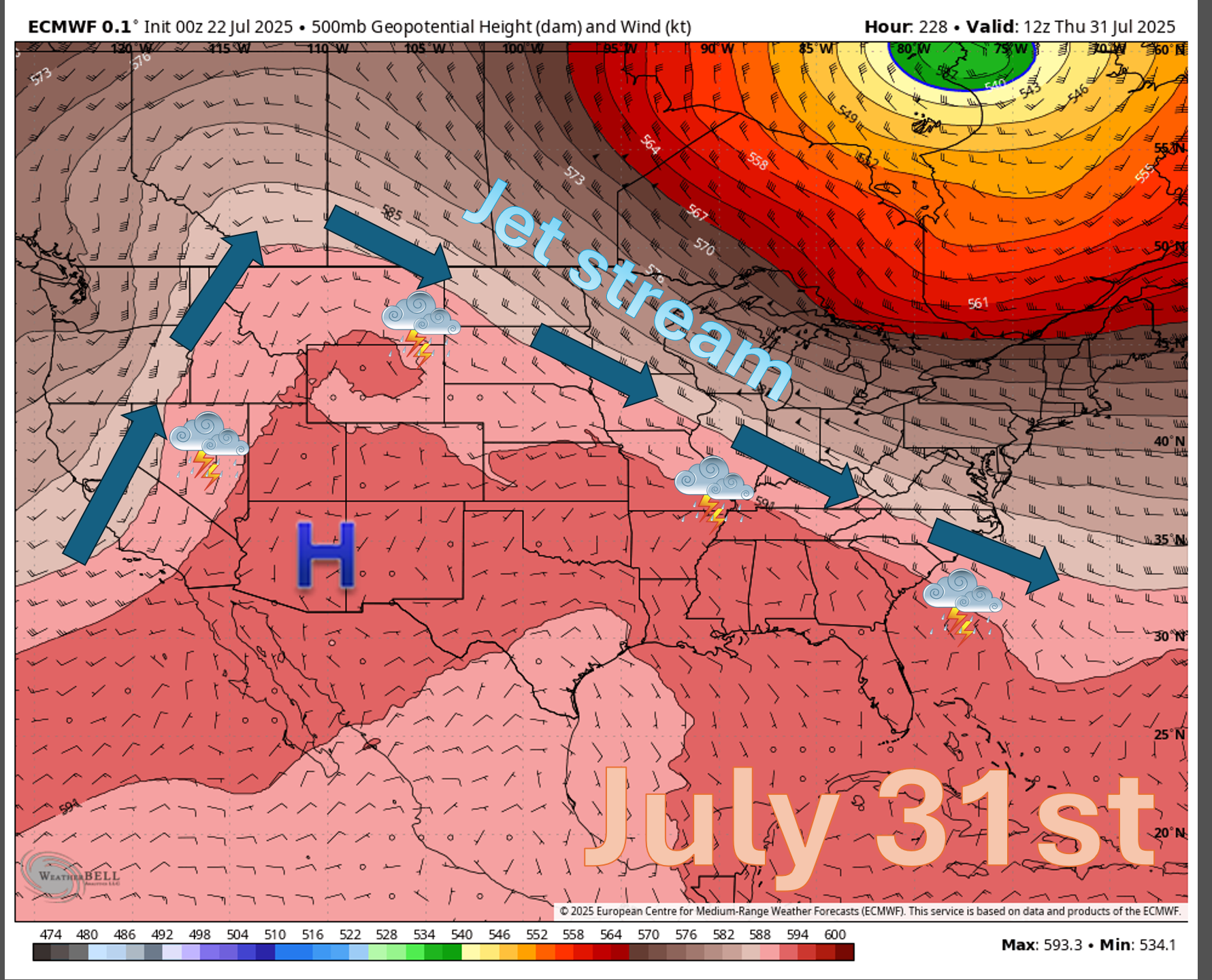 •   July thunderstorms can produce strong and gusty winds.  Frequent cloud-to-ground lightning, as well.