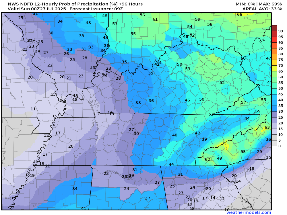 I will be monitoring Friday through Sunday.  Thunderstorm chances may increase slightly.  For now, I kept them around thirty-perfect.