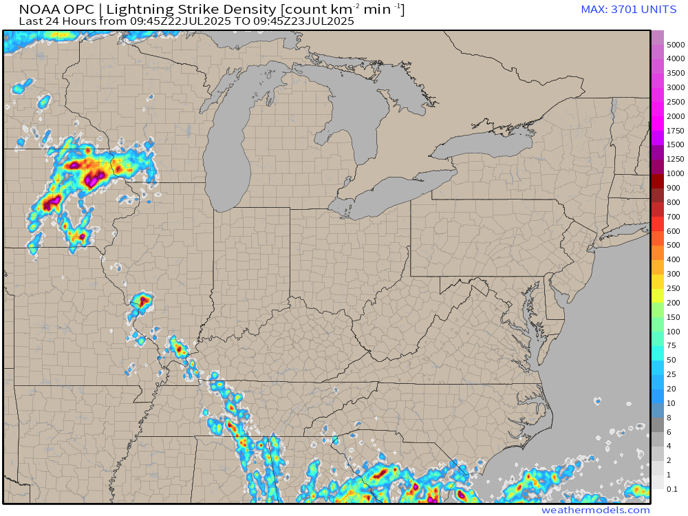 Check out the lightning strikes from the past 24 hours.  You can see where storms developed.   They extend northwest to southeast along a stalled weak boundary.  That is why the lightning is lined up.  That boundary hasn’t moved in the past two days.