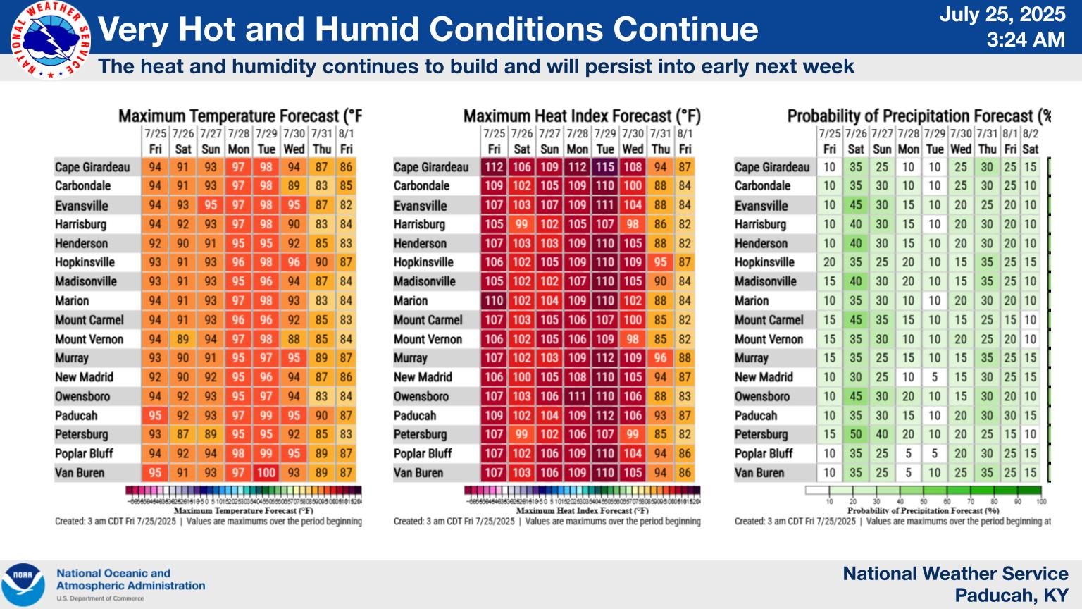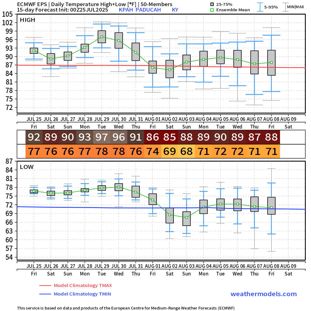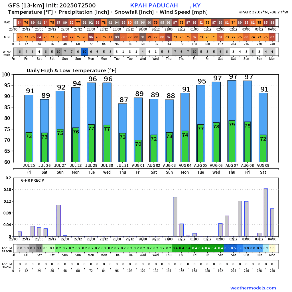 This graphic is for Paducah (central location). The rest of the region shows similar numbers. We expect temperatures to reach the mid-to-upper nineties by Monday and Tuesday. Then, finally, somewhat cooler temperatures are expected late next week.