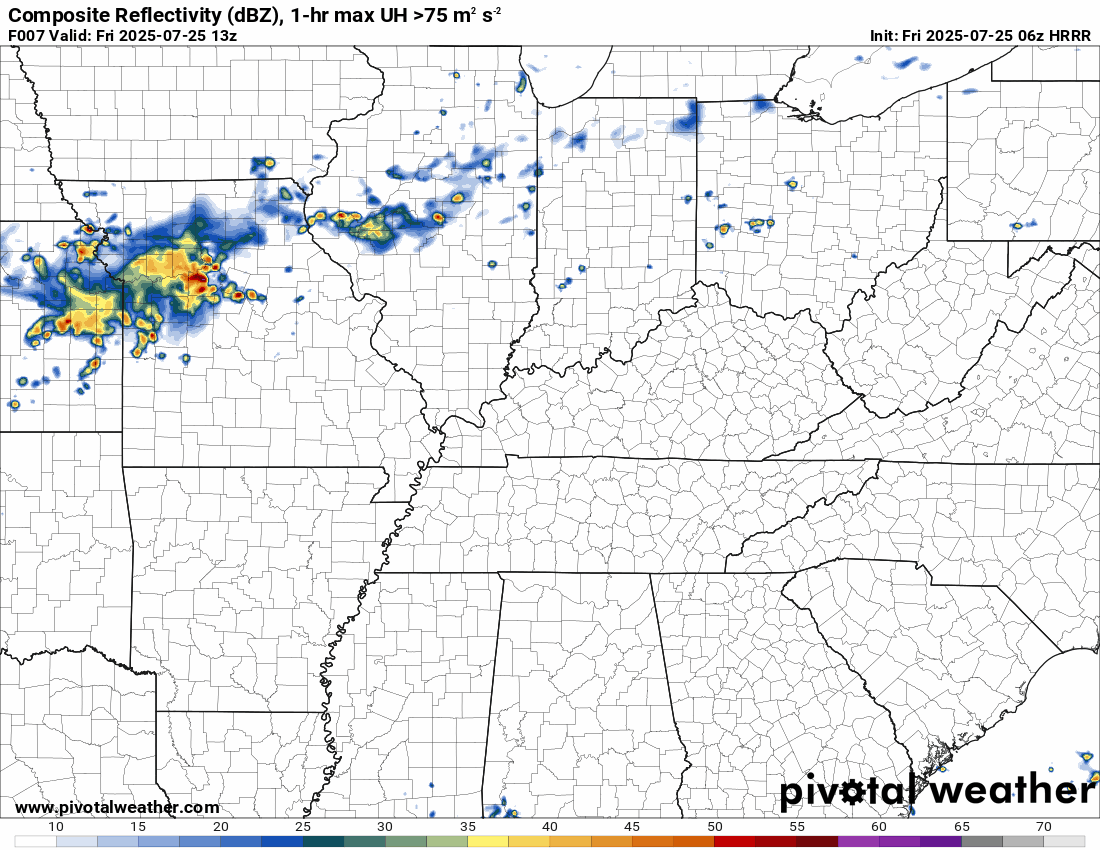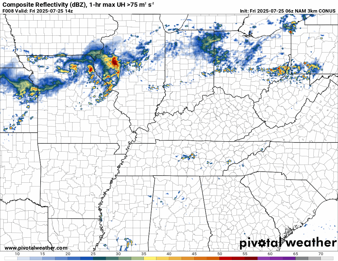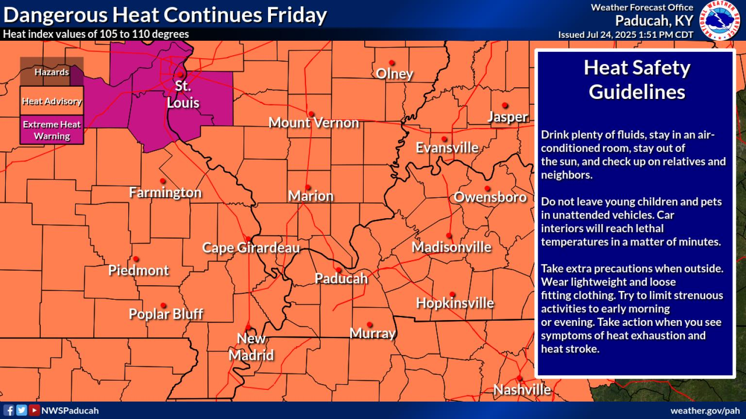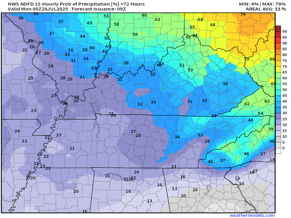 This graphic is for Paducah (central location). The rest of the region shows similar numbers. We expect temperatures to reach the mid-to-upper nineties by Monday and Tuesday. Then, finally, somewhat cooler temperatures are expected late next week.