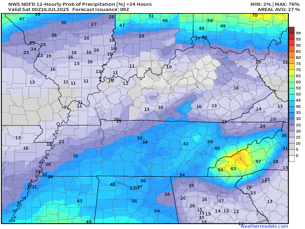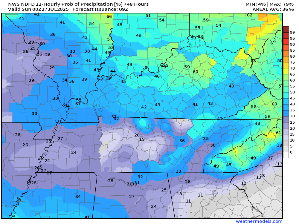 We do have slightly higher thunderstorm chances tomorrow and Sunday. I capped the rain probabilities at 30%.