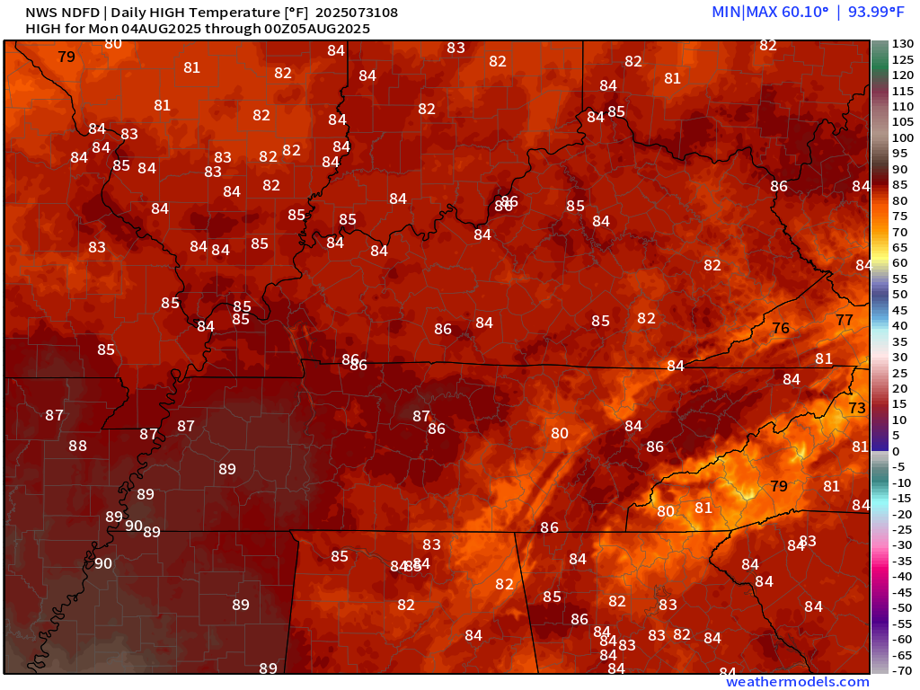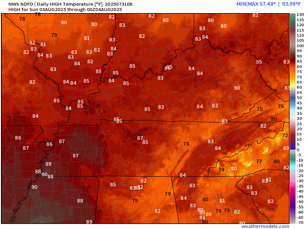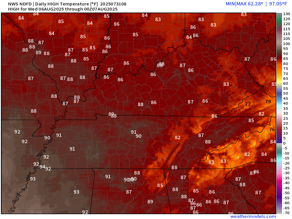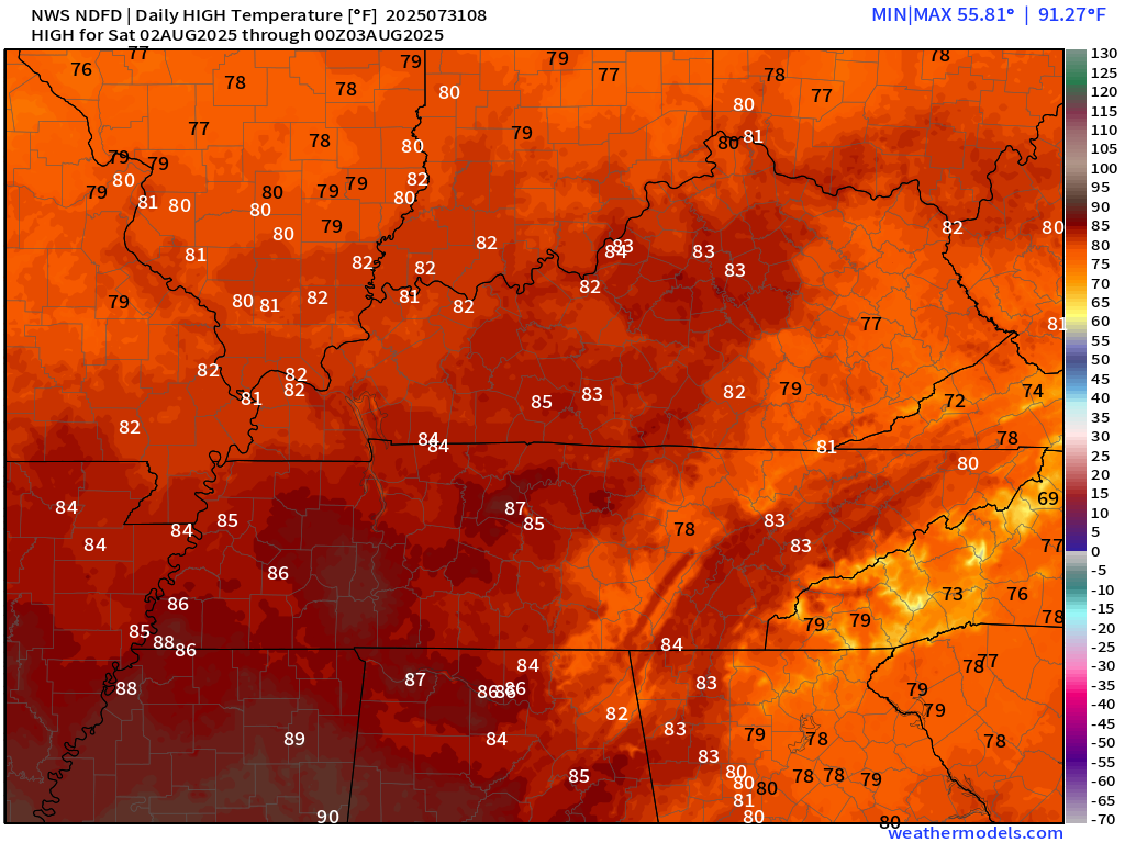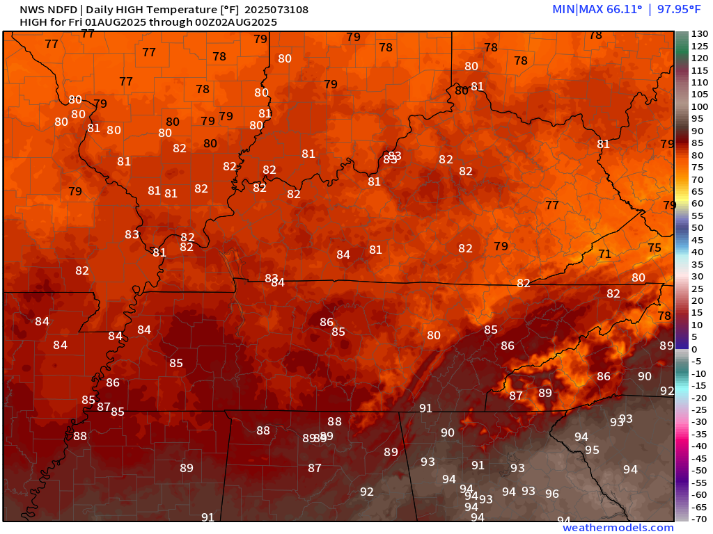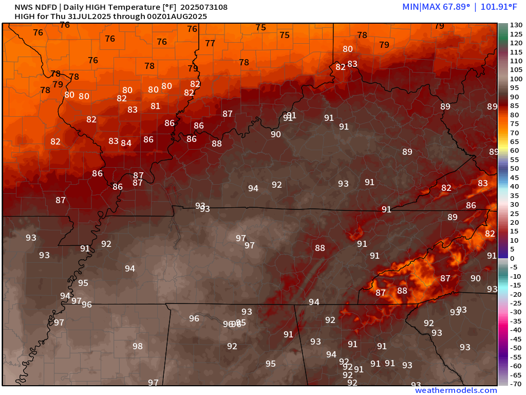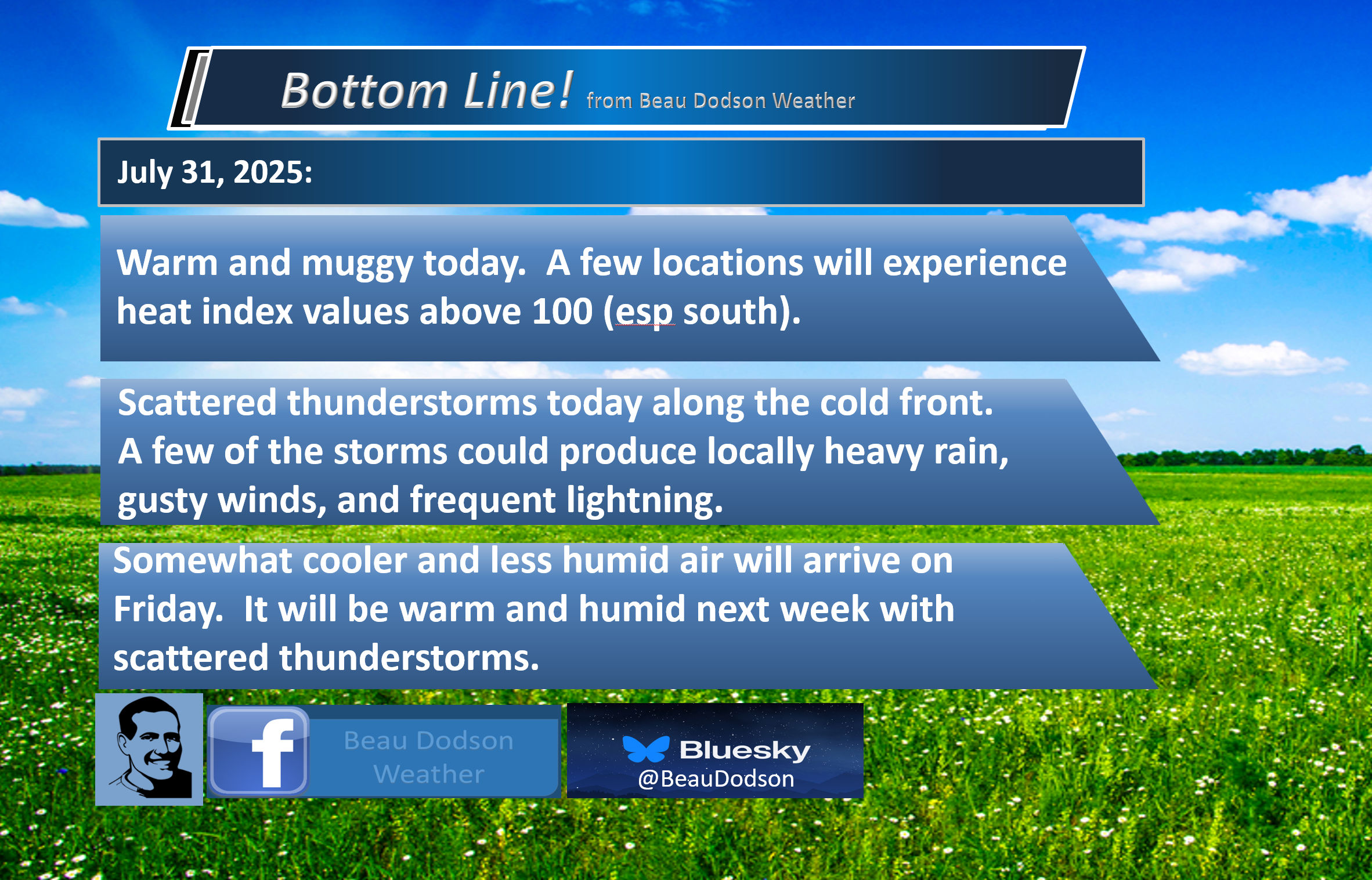 7. Will the heat index (feels like) rise above 100 degrees? POSSIBLE. Heat index values of 100 to 108 degrees are possible this afternoon south of the cold front. The risk of that is a bit higher across the Missouri Bootheel, western Kentucky, and western Tennessee.