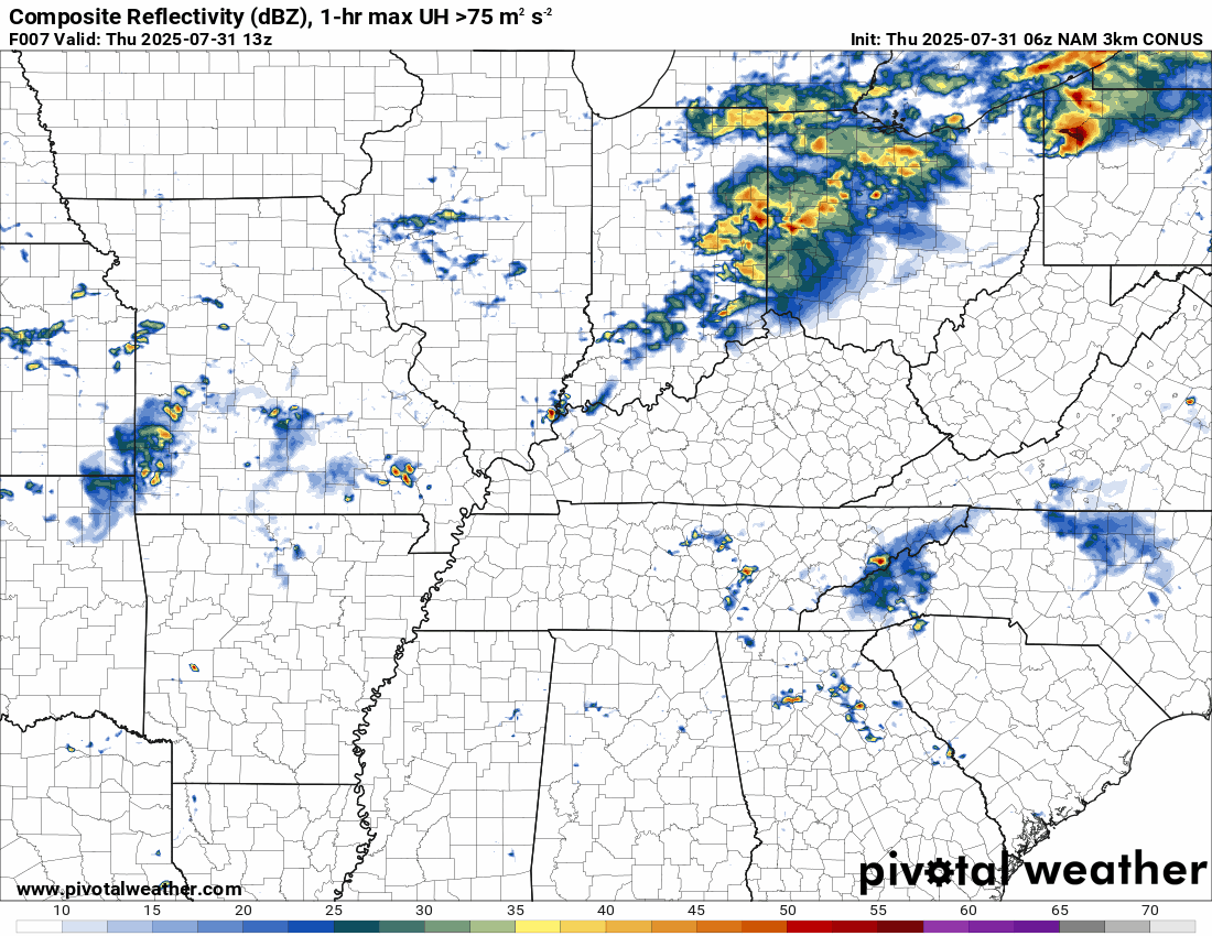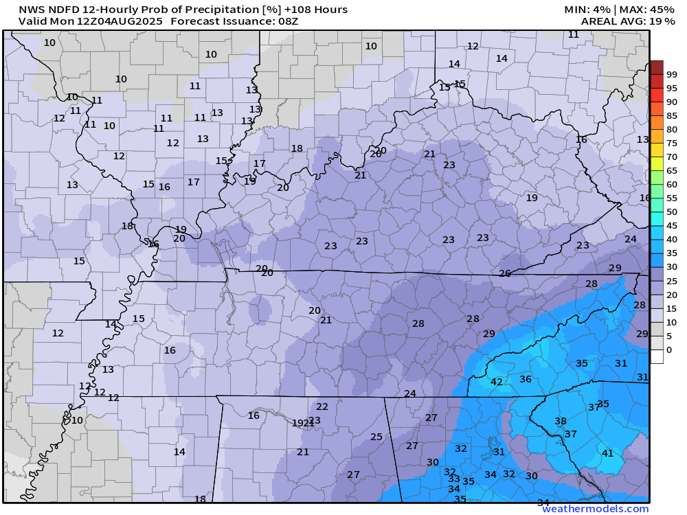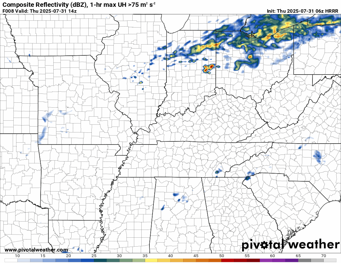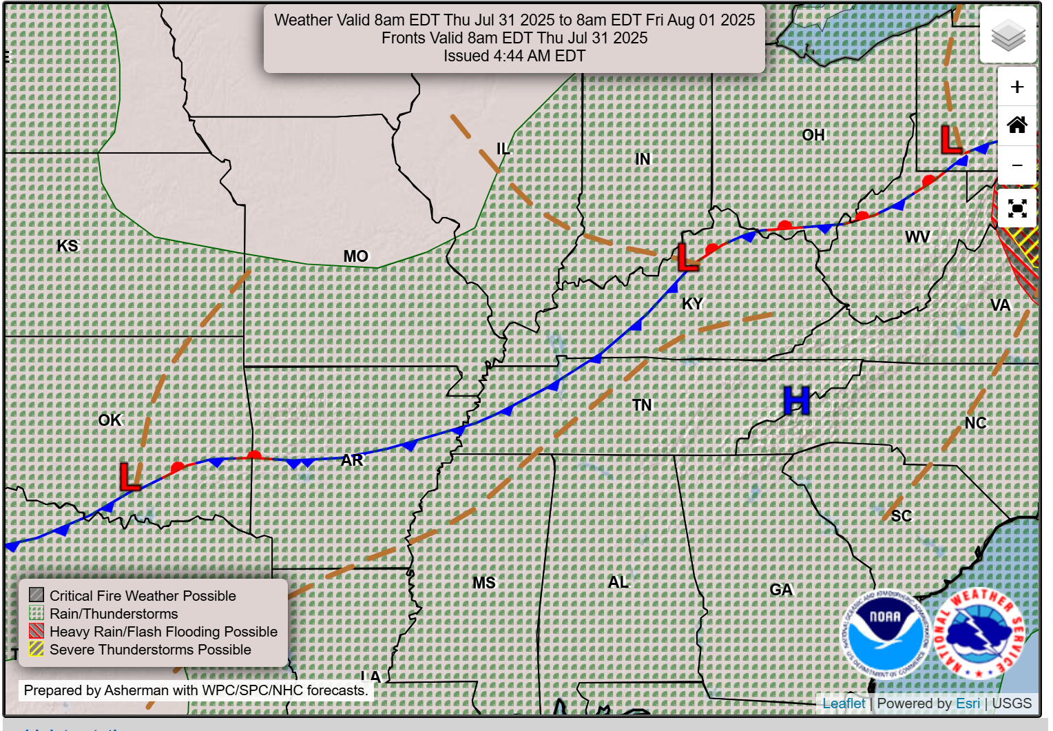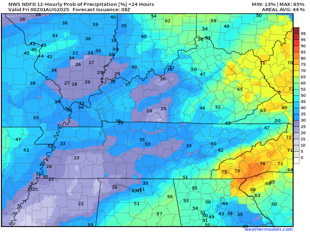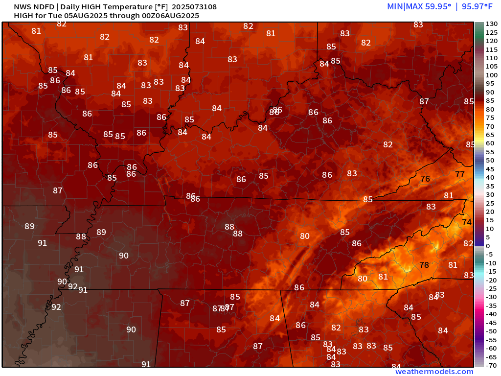 7. Will the heat index (feels like) rise above 100 degrees? POSSIBLE. Heat index values of 100 to 108 degrees are possible this afternoon south of the cold front. The risk of that is a bit higher across the Missouri Bootheel, western Kentucky, and western Tennessee.