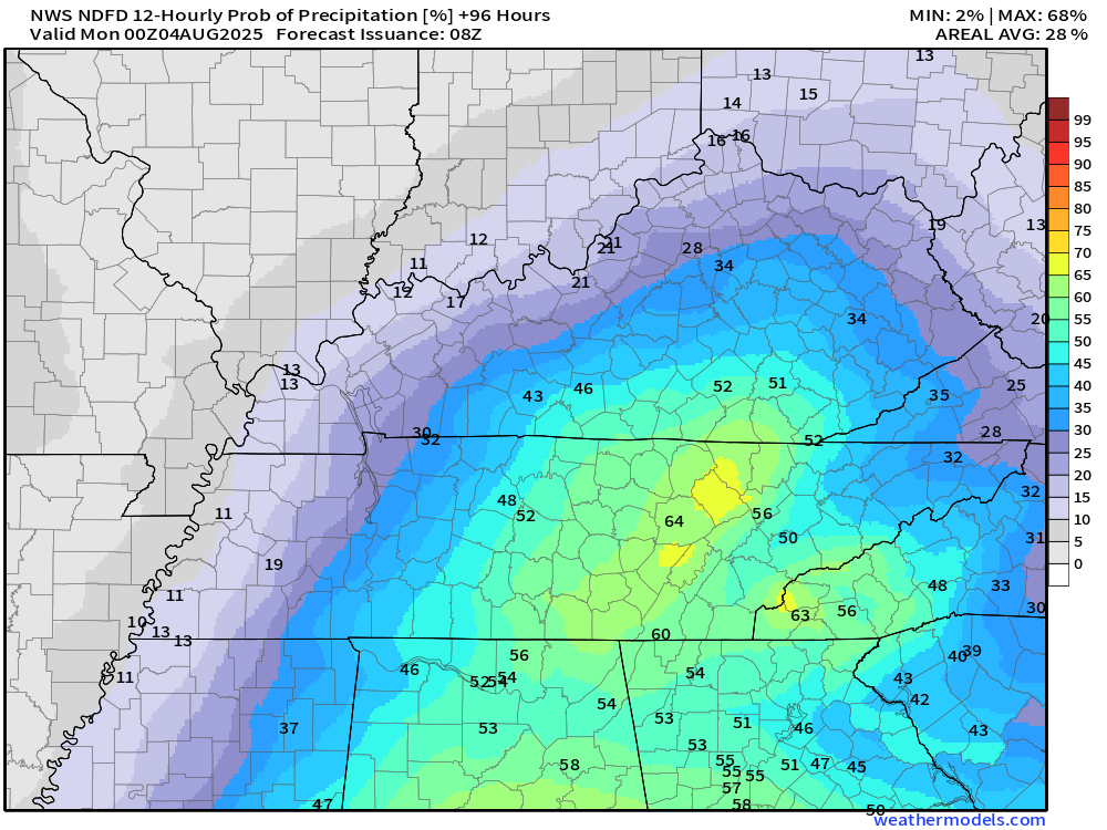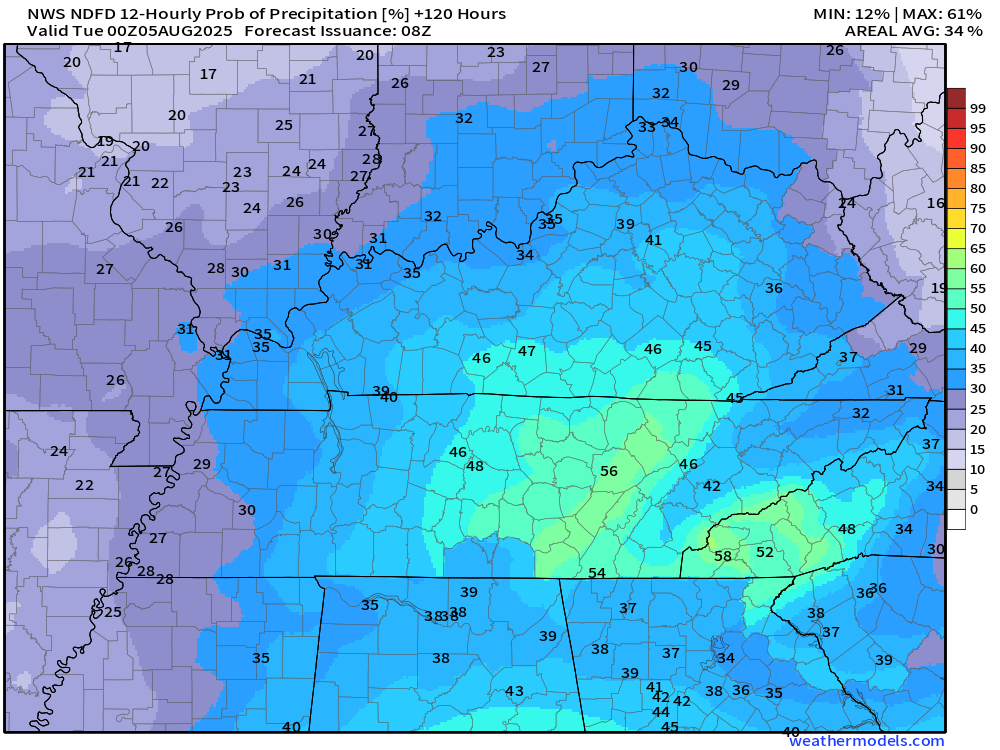 Next week, we will have daily chances of showers and thunderstorms, probably in the 30% to 40% range. I can’t rule out periods where rain chances rise above 40%, but there is no clear signal for that, yet.