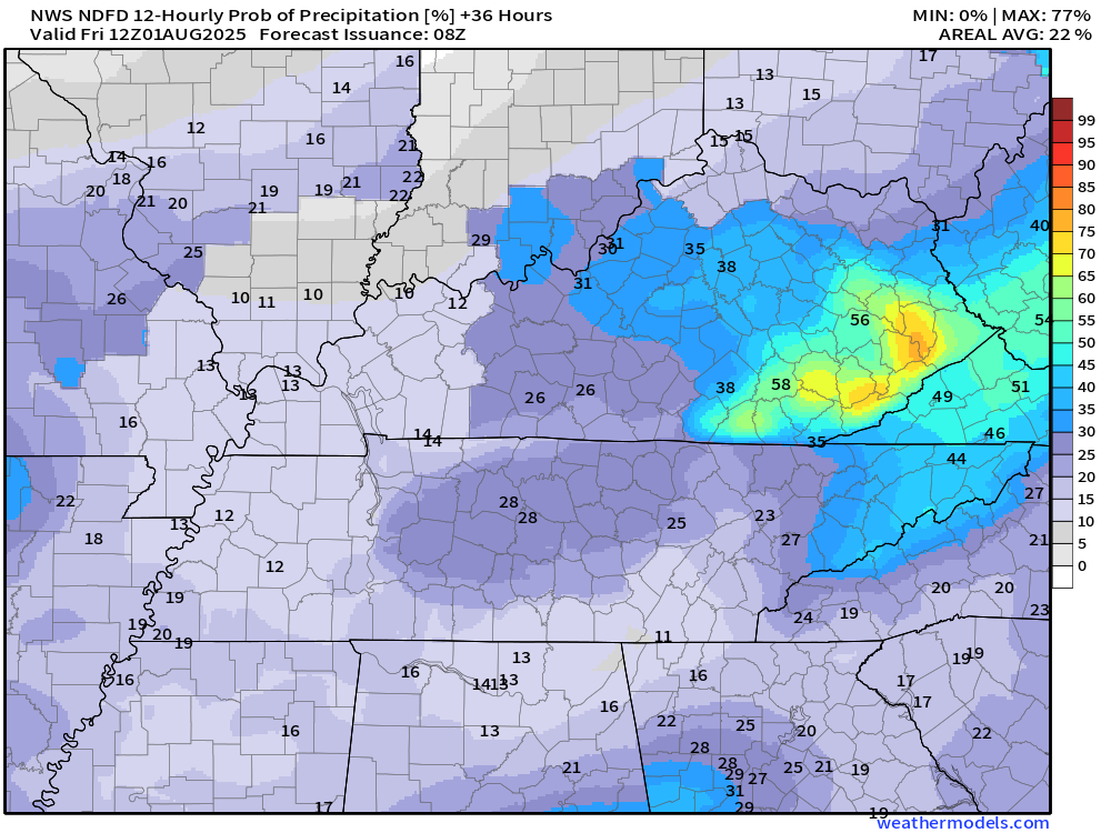 Isolated storms are possible on Friday. Mainly near the MO/AR and KY/TN border. Closer to the front. Most of the area will remain dry.