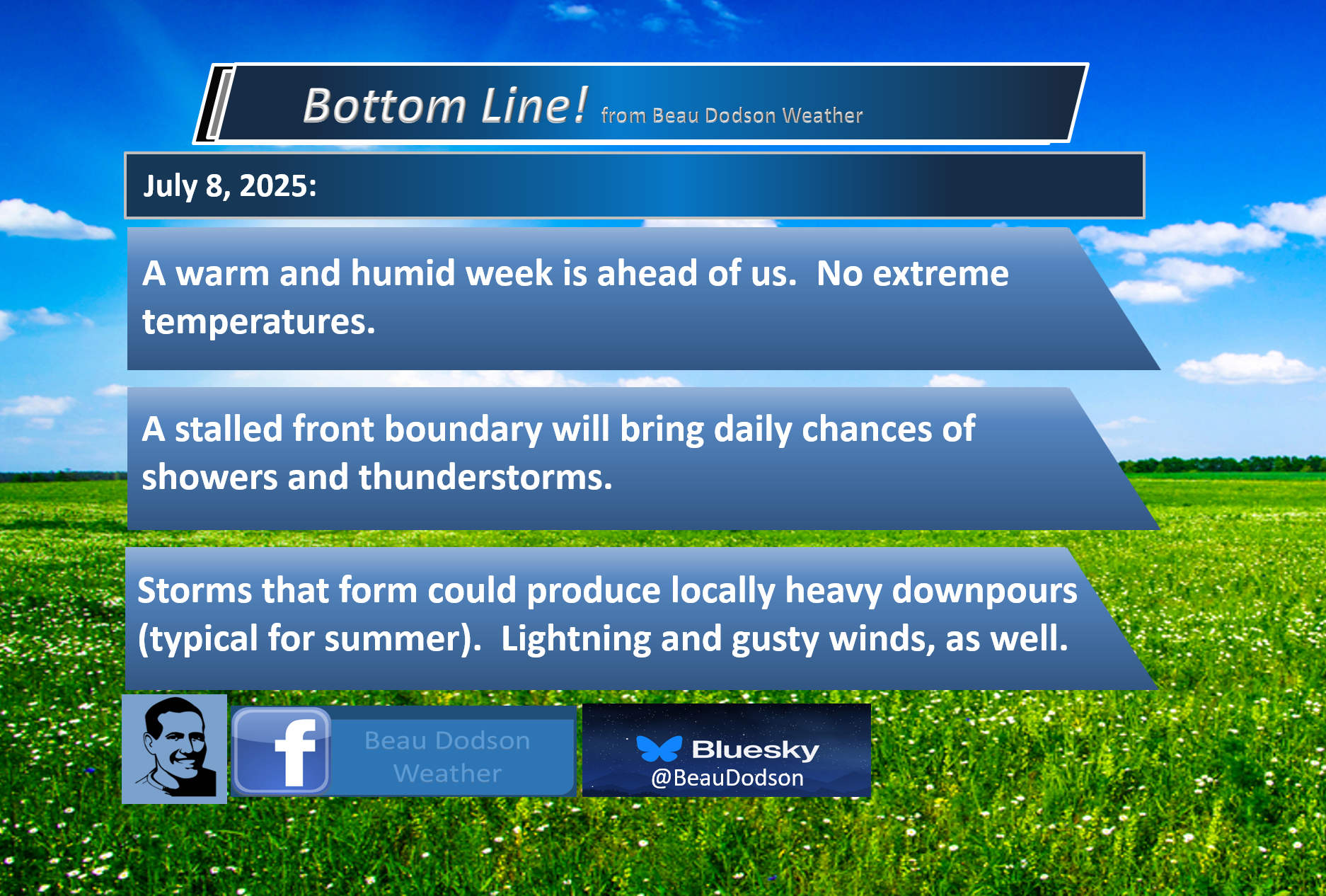 July 8, 2025: Unsettled weather to continue. Daily chances of thunderstorms. Warm and humid.
