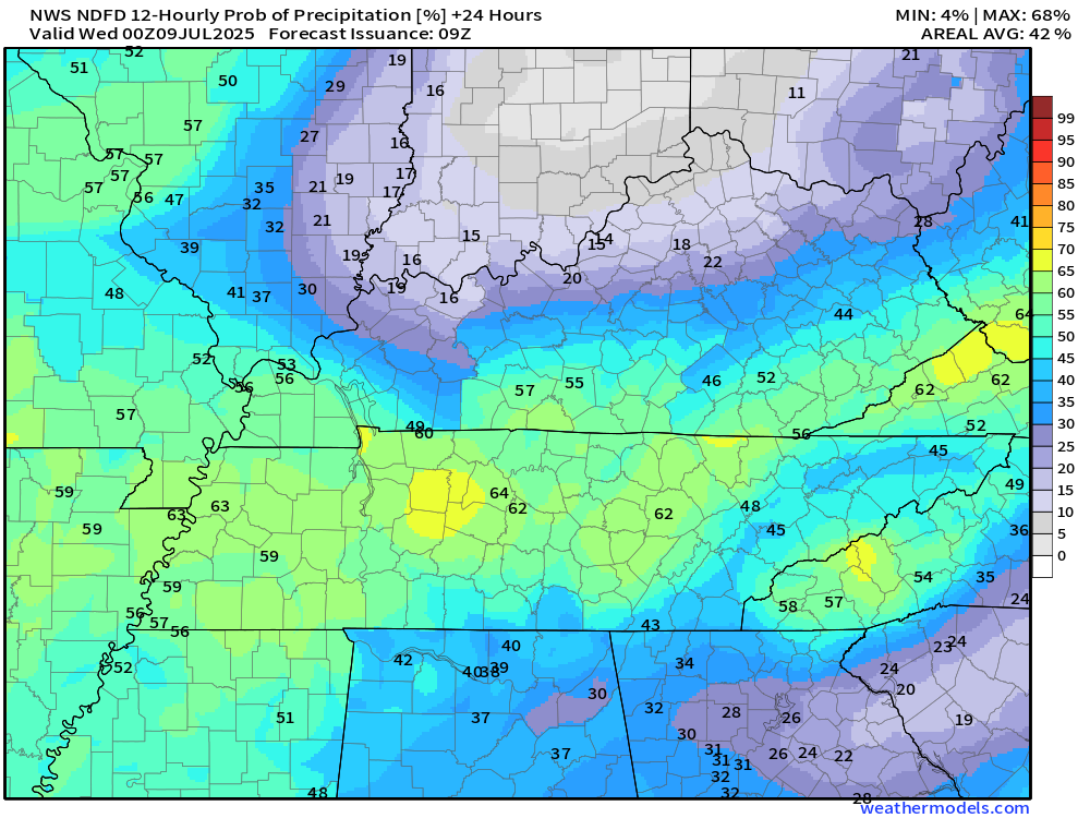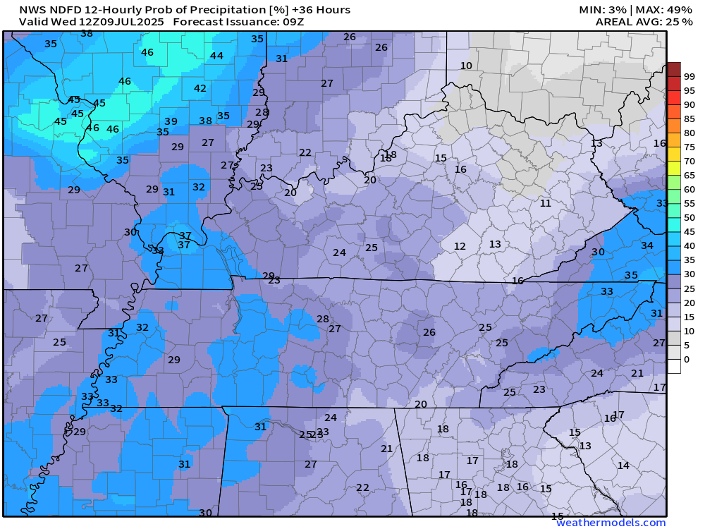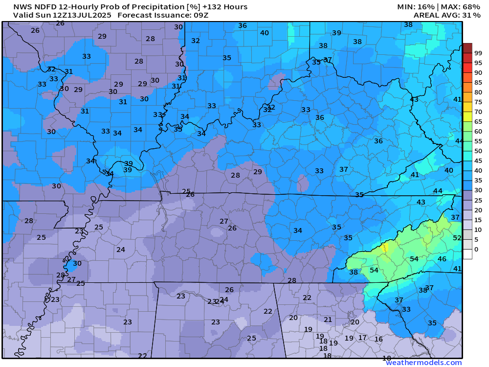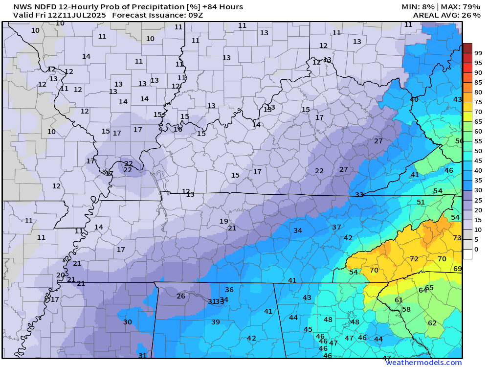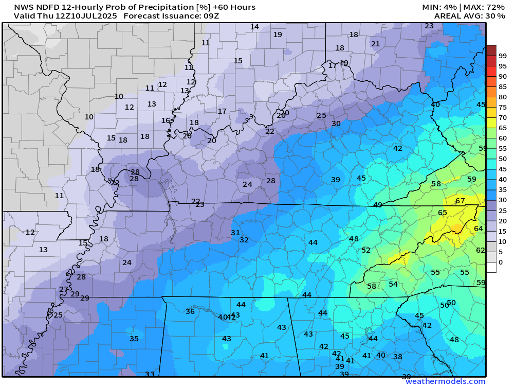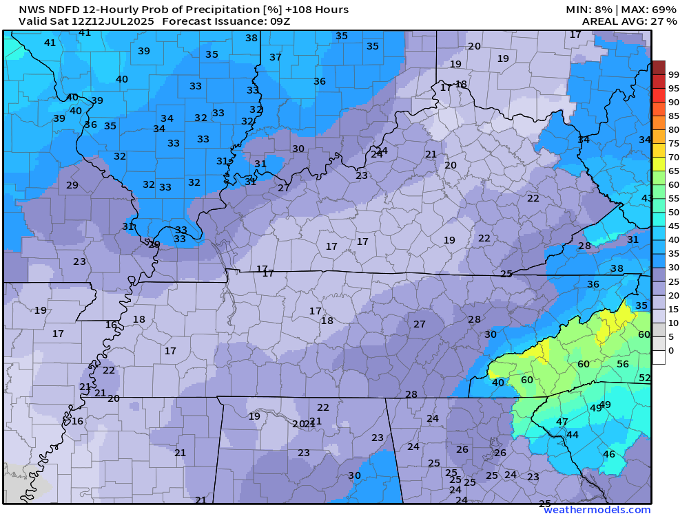 Let me show you the current rain probabilities.  Remember, a 20% chance of thunderstorms during the summer months usually means someone will have a gullywasher, but many areas will remain dry.  It does not mean that it won’t rain on your picnic.