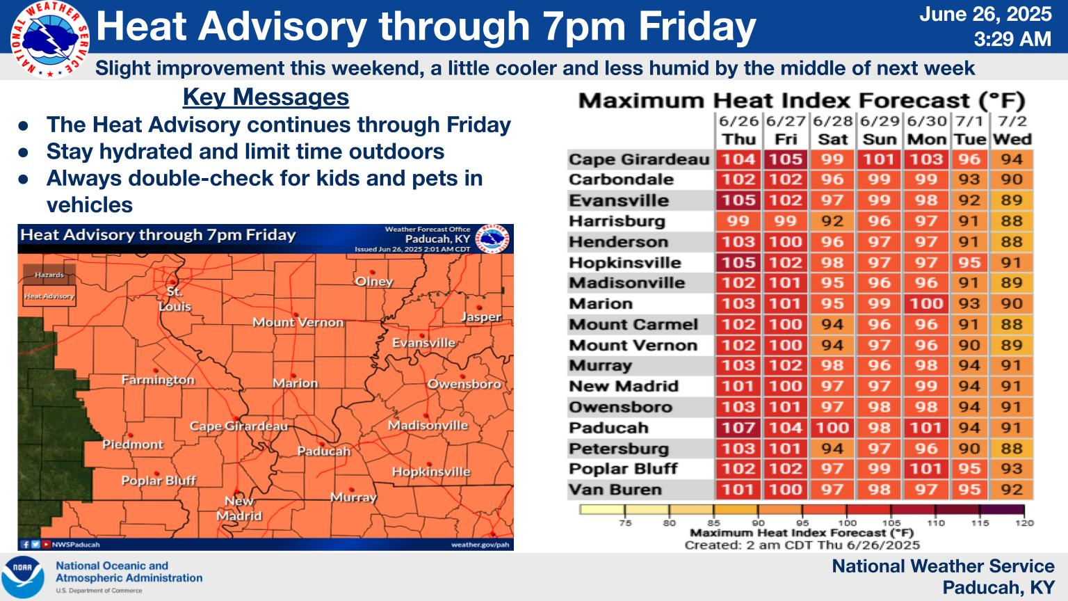 6. Will the heat index rise above 100 degrees? YES.    Heat index values will approach and exceed 100 degrees today through Saturday.  I will monitor Sunday.