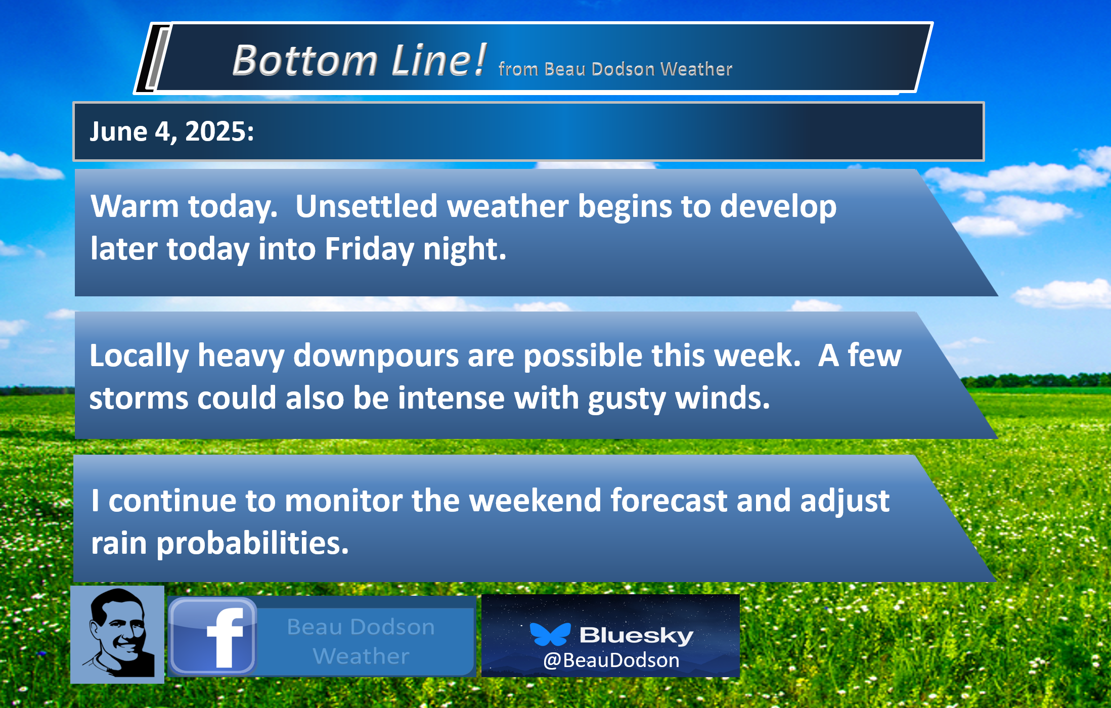 3. Is flash flooding in the forecast? ISOLATED ISSUES. Locally heavy thunderstorms are expected today into the weekend. Several rounds of showers and thunderstorms. This could result in brief flooding issues. Ditches overflowing, commonly flooded roadways, and so on.