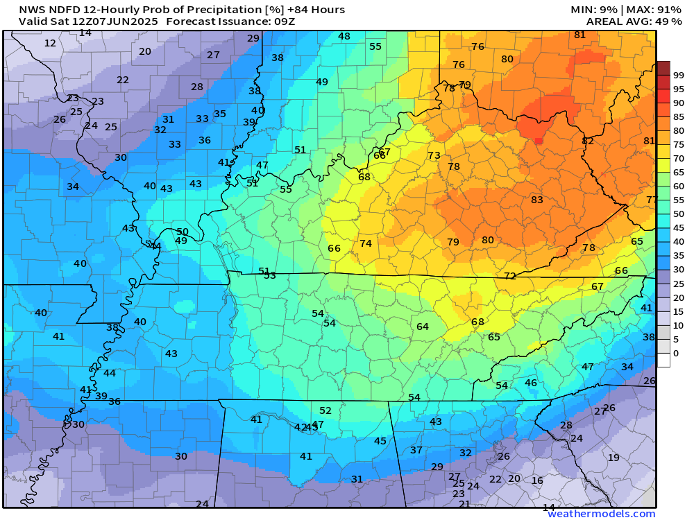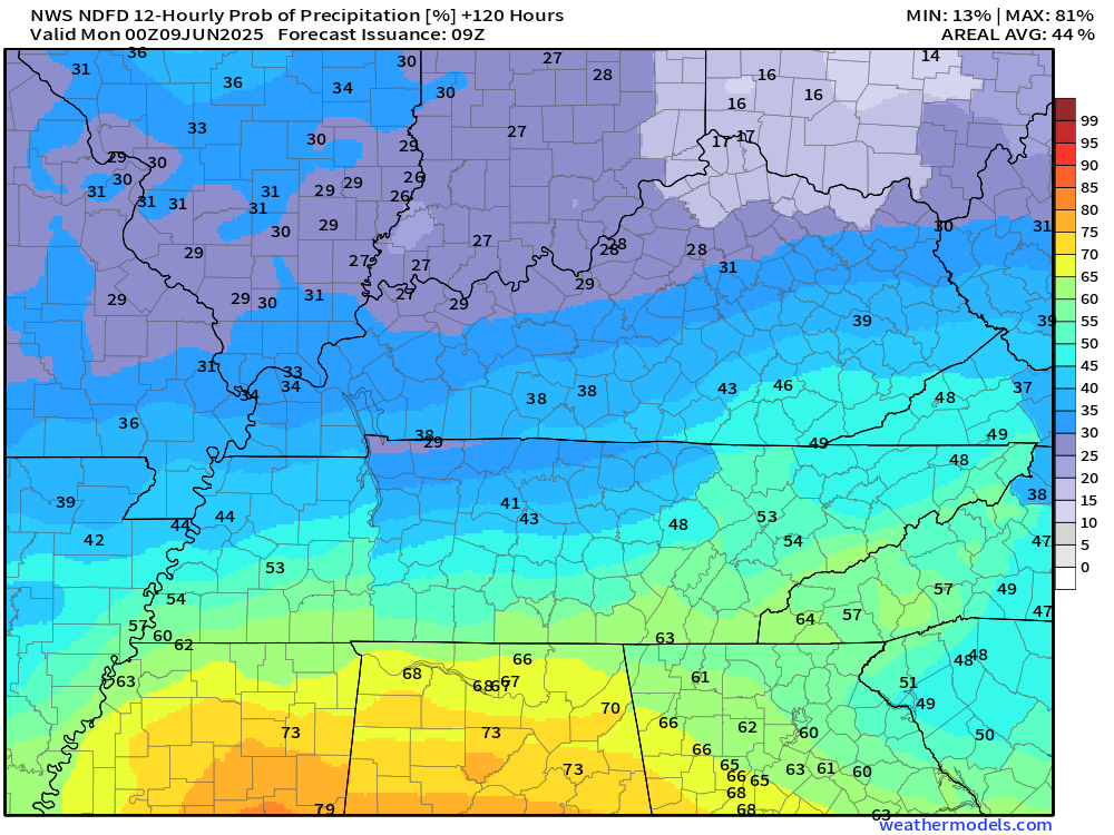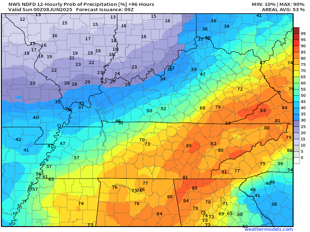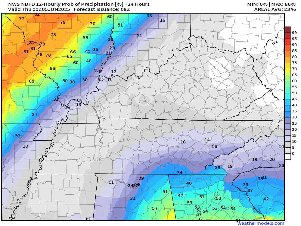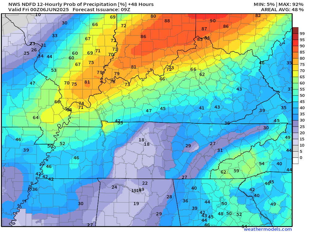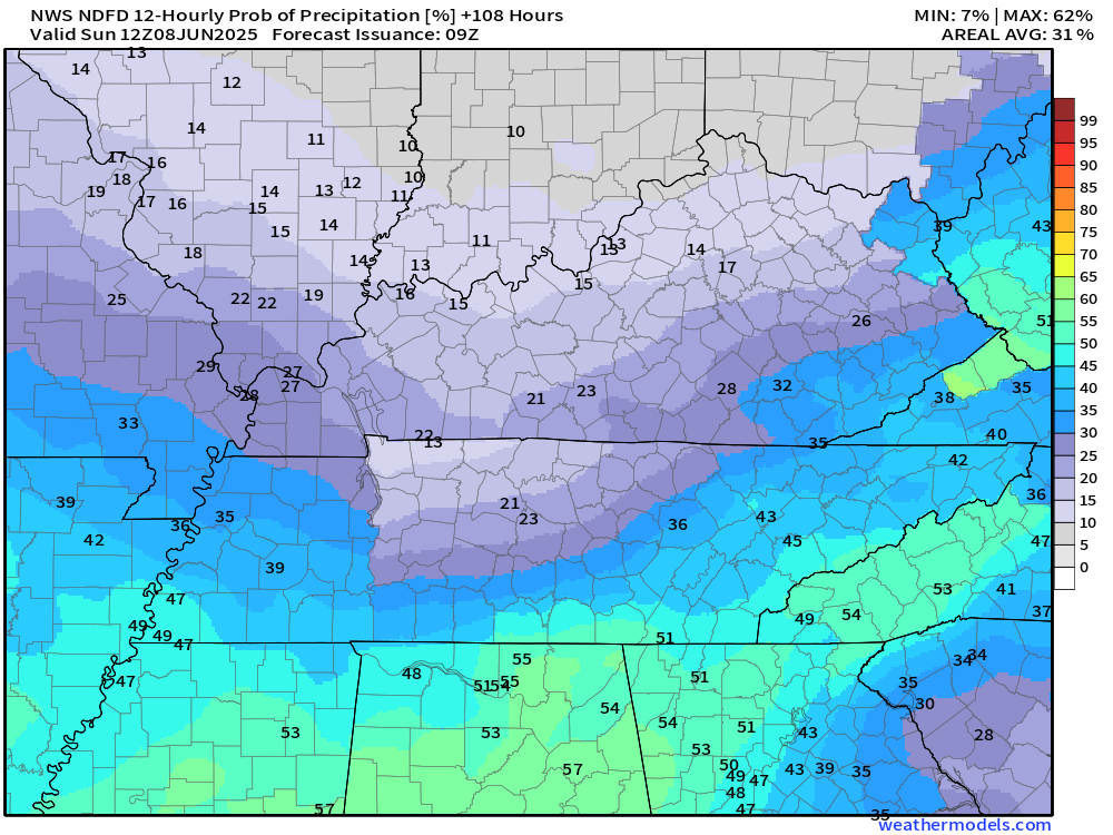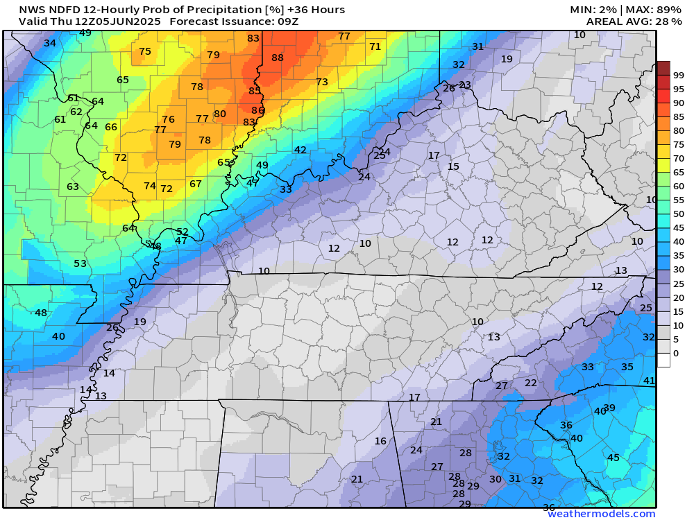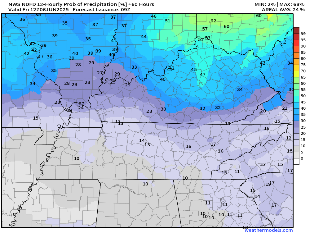 Wednesday (rain chances will be higher over Missouri and Illinois vs Kentucky/Tennessee)