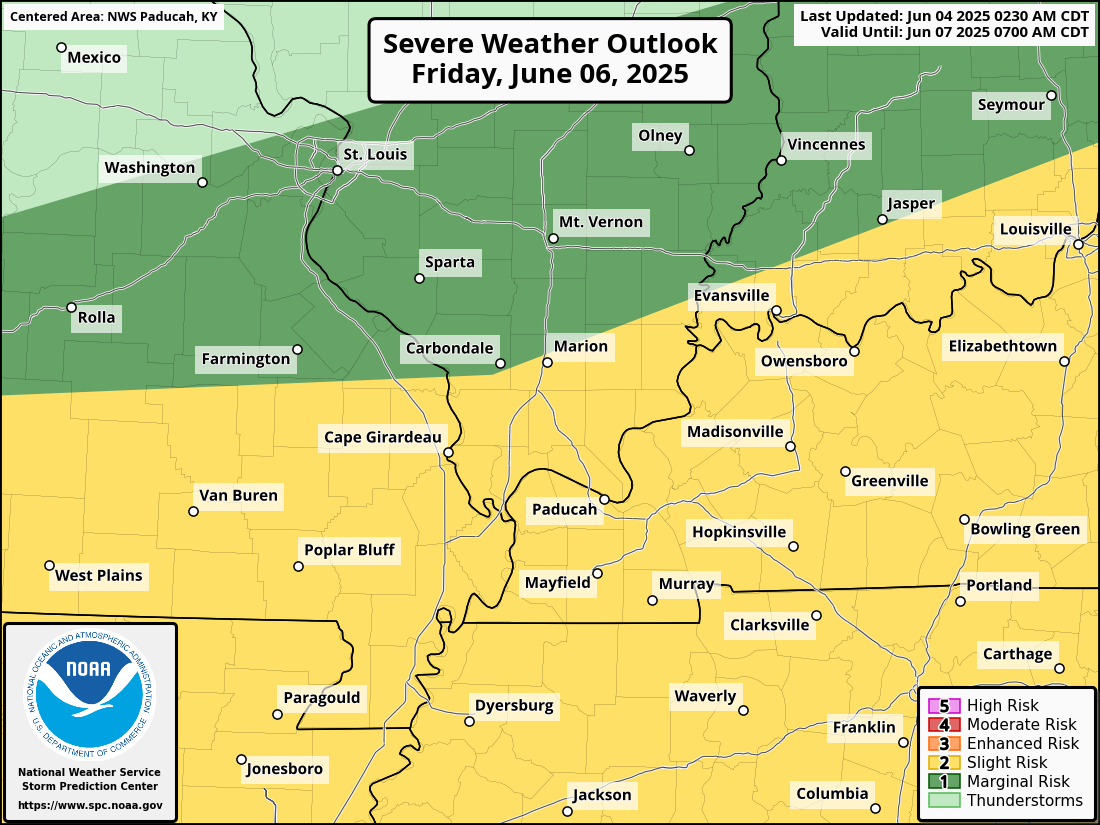 Finally, here is Friday’s SPC severe weather outlook. A level one and two risk. Again, Friday may have the highest probability of severe thunderstorms. The level one risk is in dark green. The level two risk is in yellow.