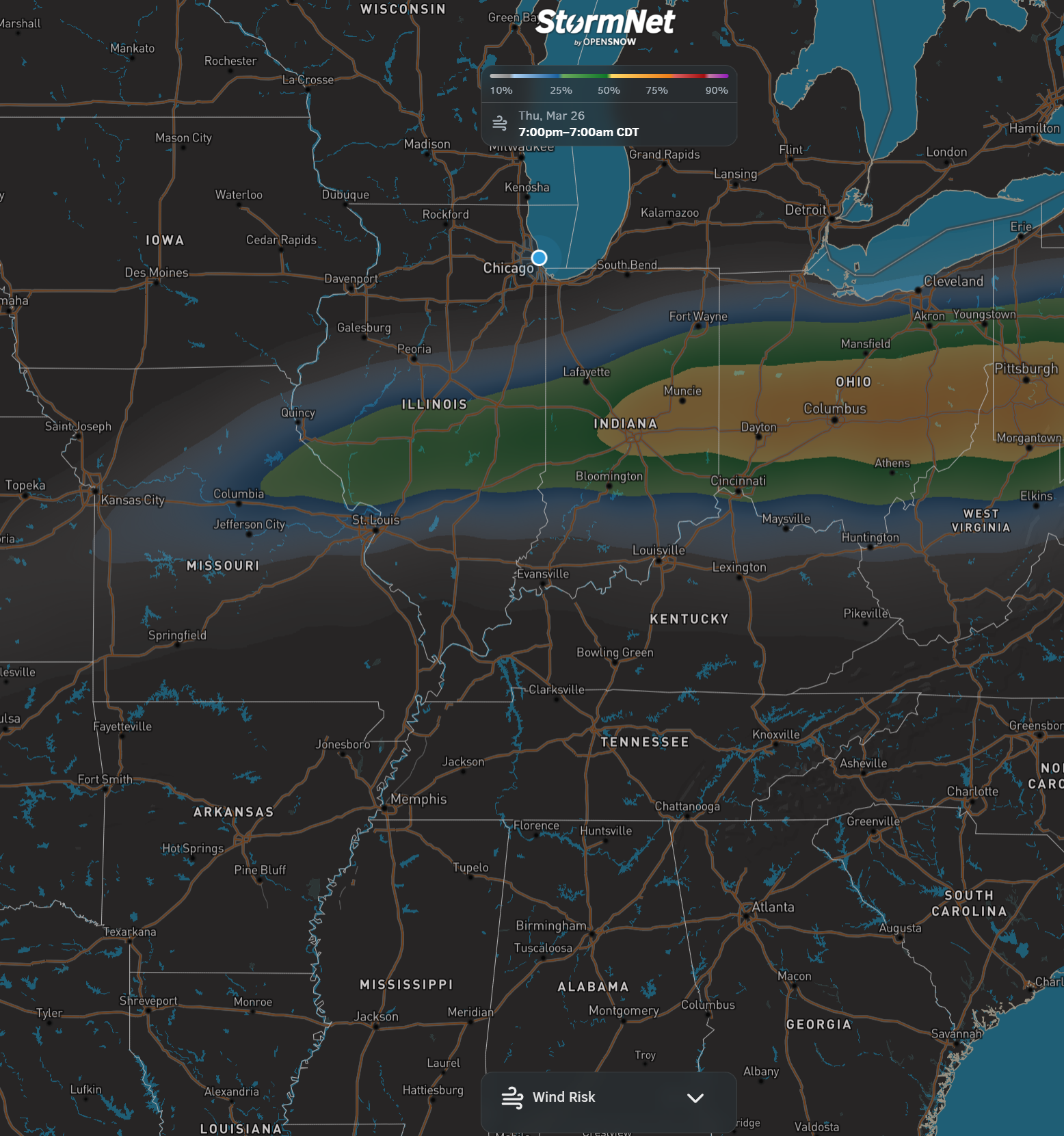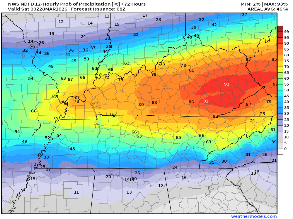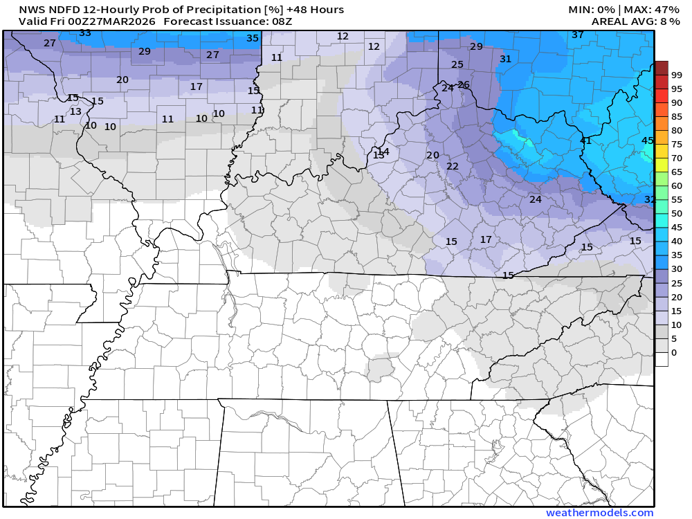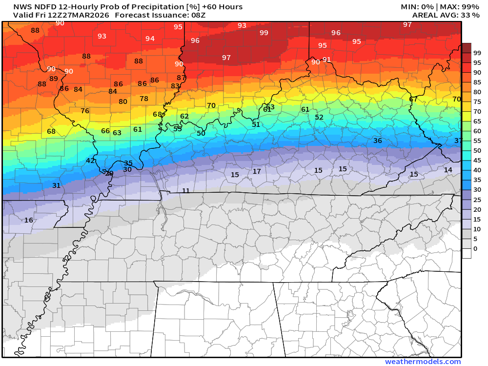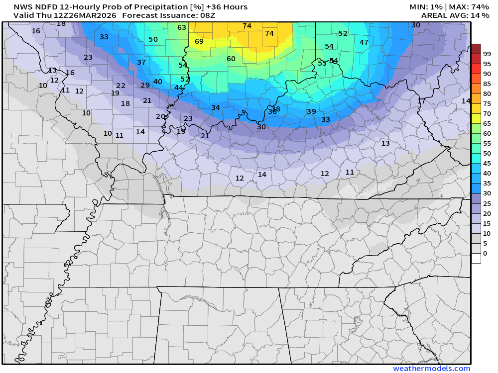 The chances will be higher over southeast Illinois and northwest Kentucky.